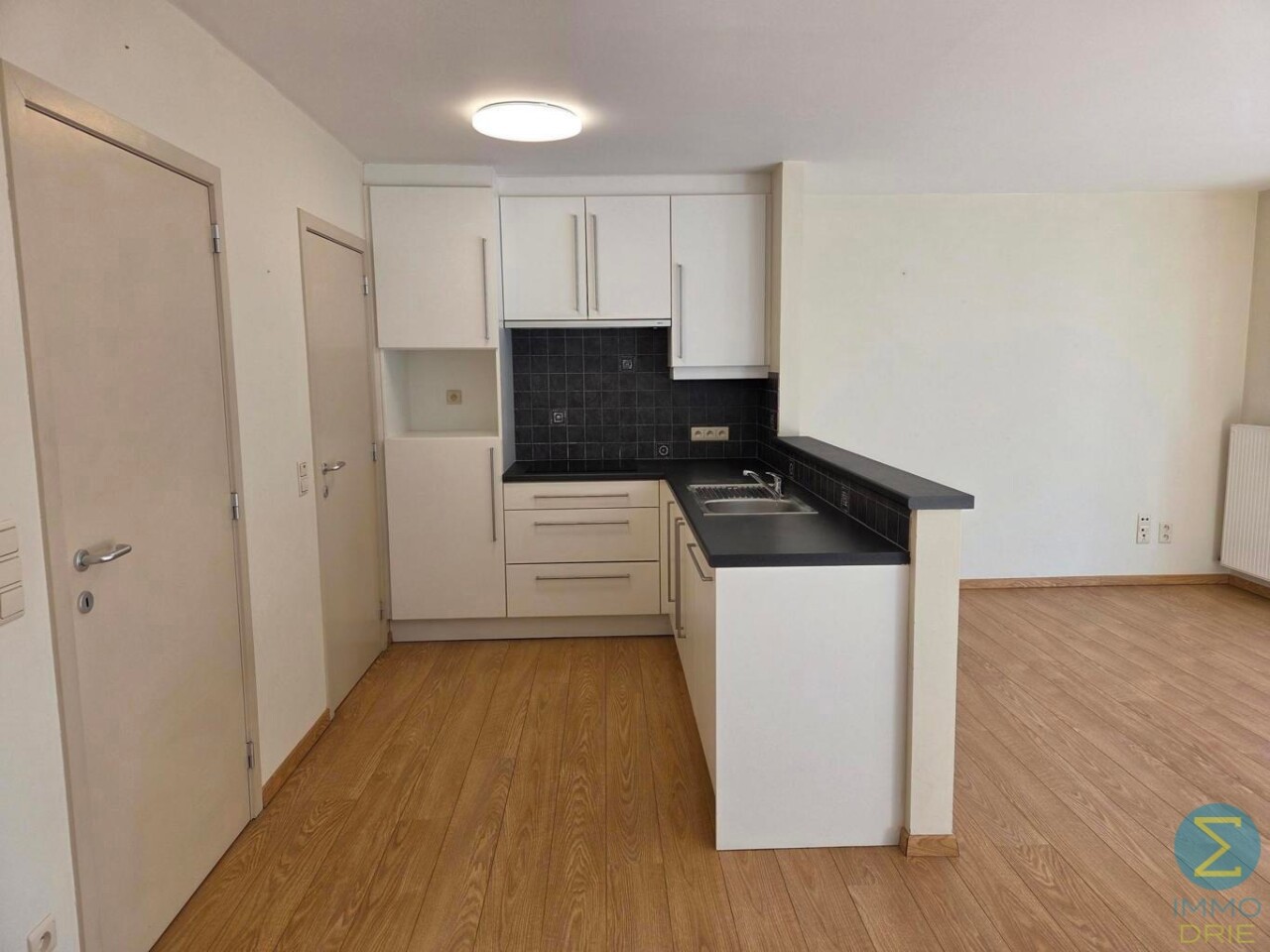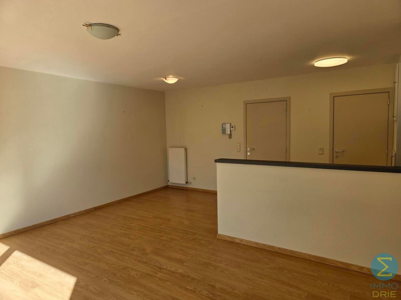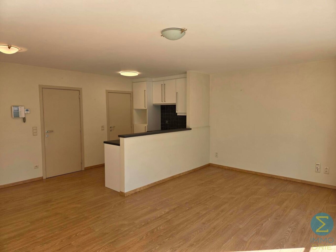 Bij het betreden van het appartement komen we in de centrale inkomhal, die alle woonvertrekken op een praktische manier met elkaar verbindt. Vanuit deze hal stappen we binnen in de lichtrijke leefruimte, waar de grote raampartijen meteen in het oog springen. Ze zorgen niet alleen voor natuurlijk licht, maar bieden ook een prachtig, open zicht op het plein en de kerk, wat deze woonruimte een bijzonder aangenaam karakter geeft.