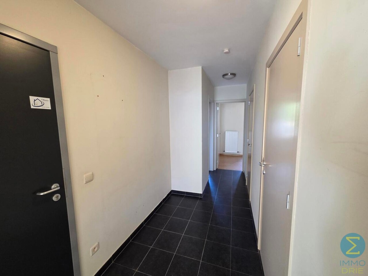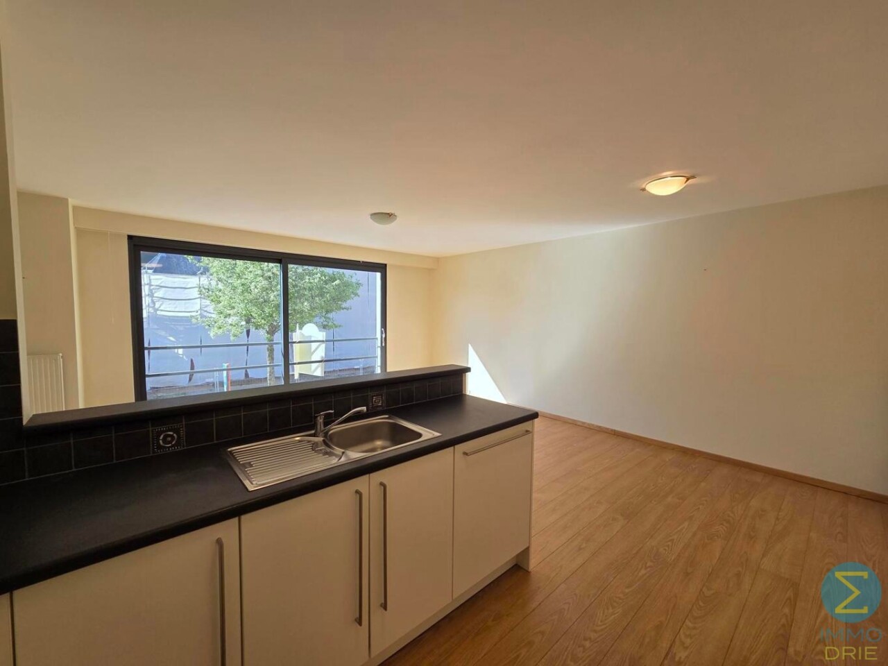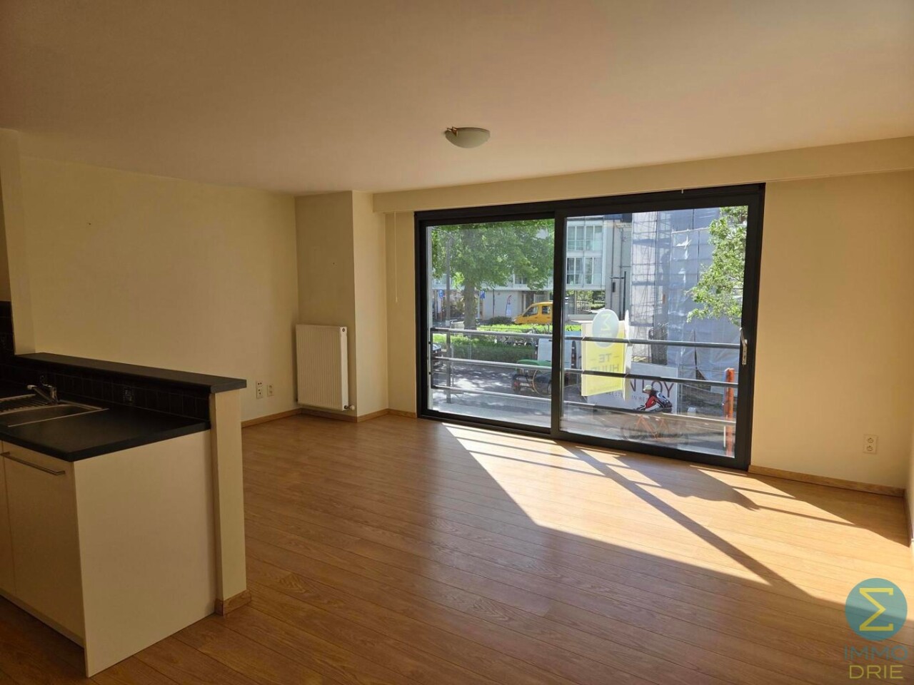 Bij het betreden van het appartement komen we in de centrale inkomhal, die alle woonvertrekken op een praktische manier met elkaar verbindt. Vanuit deze hal stappen we binnen in de lichtrijke leefruimte, waar de grote raampartijen meteen in het oog springen. Ze zorgen niet alleen voor natuurlijk licht, maar bieden ook een prachtig, open zicht op het plein en de kerk, wat deze woonruimte een bijzonder aangenaam karakter geeft.