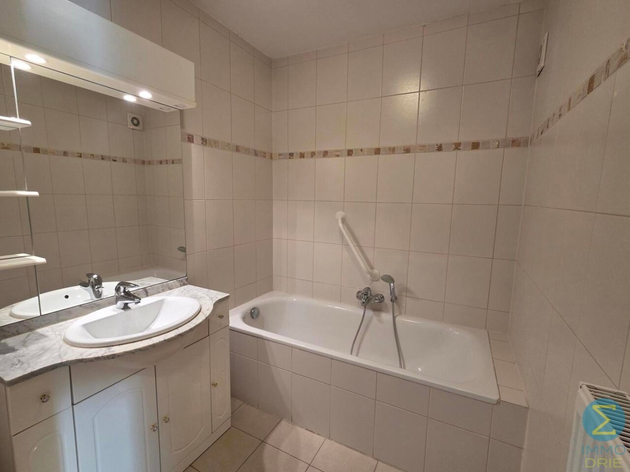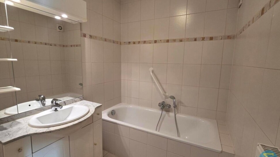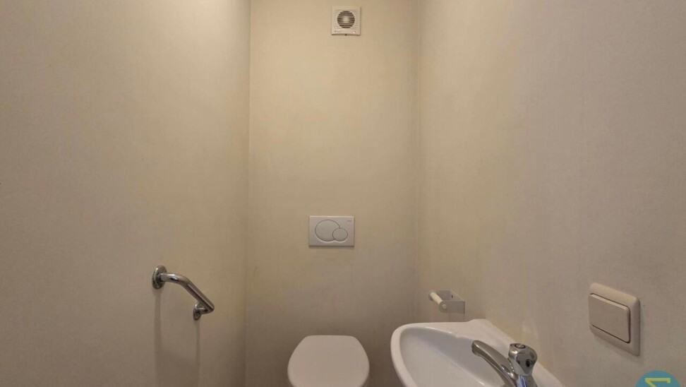 Verder vinden we in de hal een apart gastentoilet en een verzorgde badkamer, uitgerust met een ligbad met douchearmatuur en een badkamermeubel met enkele wastafel.