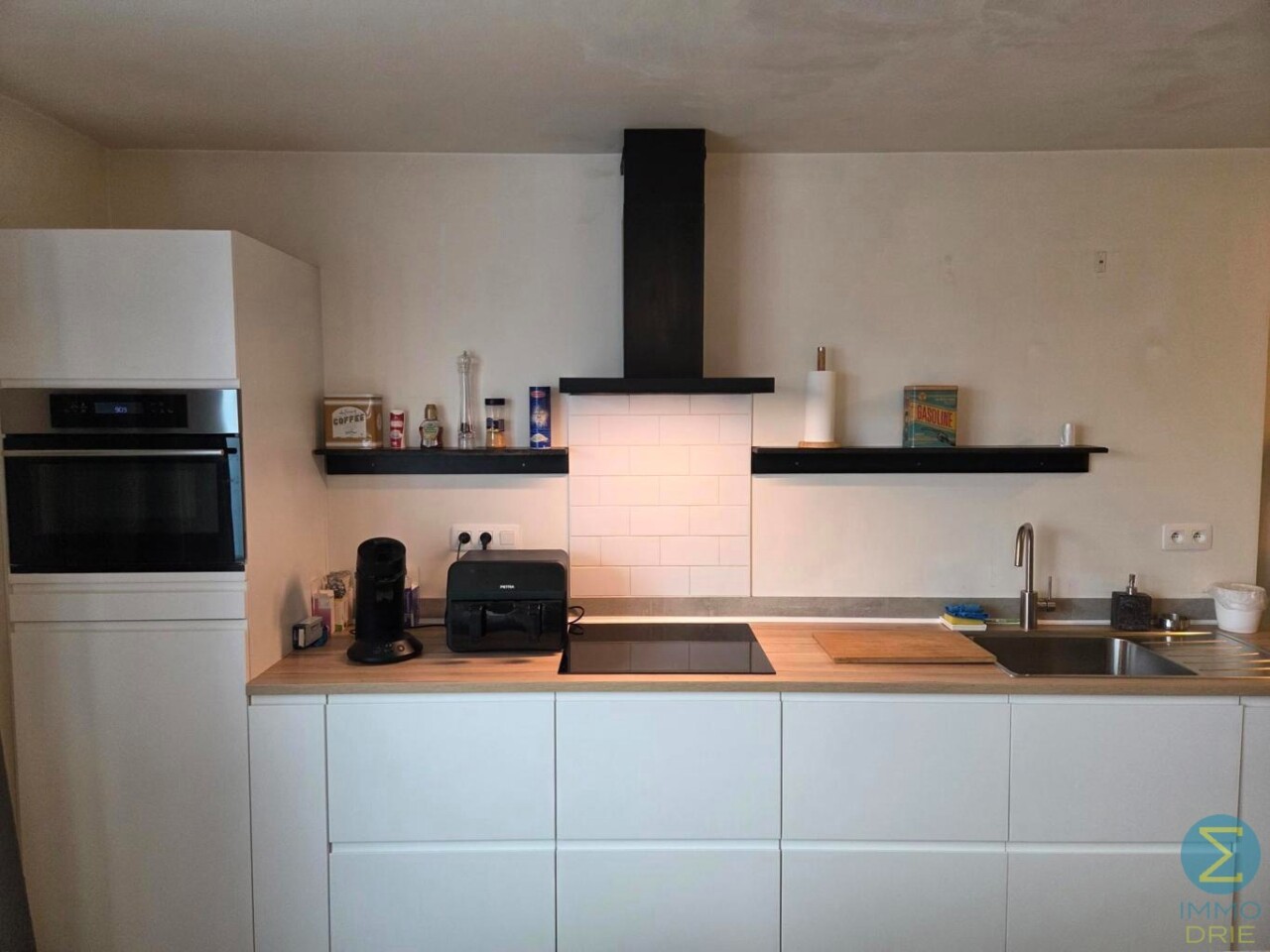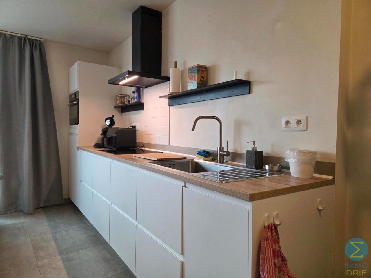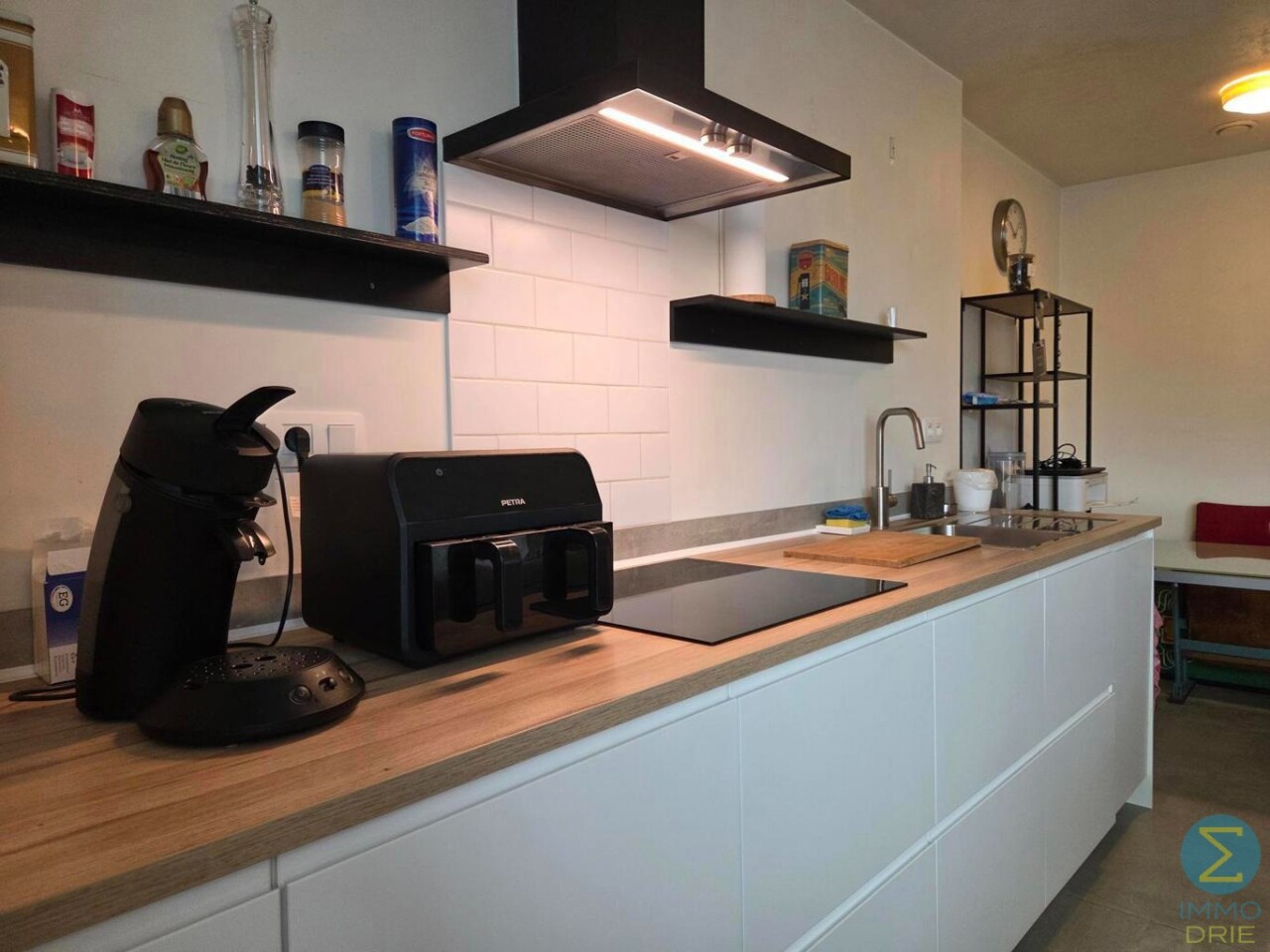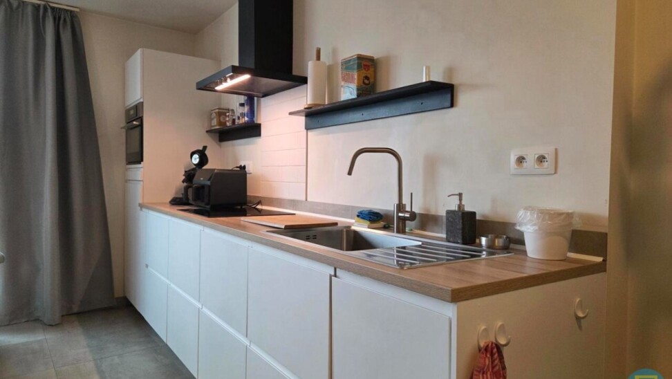 Via de inkomhal komt u in de lichtrijke woonkamer met open keuken. De keuken is volledig uitgerust met een modern keukenblok en beschikt over alle nodige toestellen, waaronder een vaatwasser, koelkast met vriesvak, inductiekookplaat en combi-oven.
