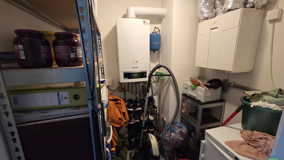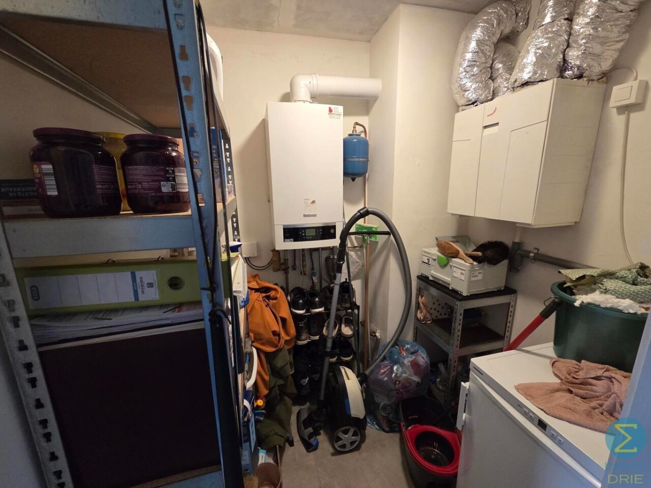 De berging is bijzonder praktisch ingericht en biedt plaats aan de cv-ketel, een aansluiting voor wasmachine en extra opbergruimte.