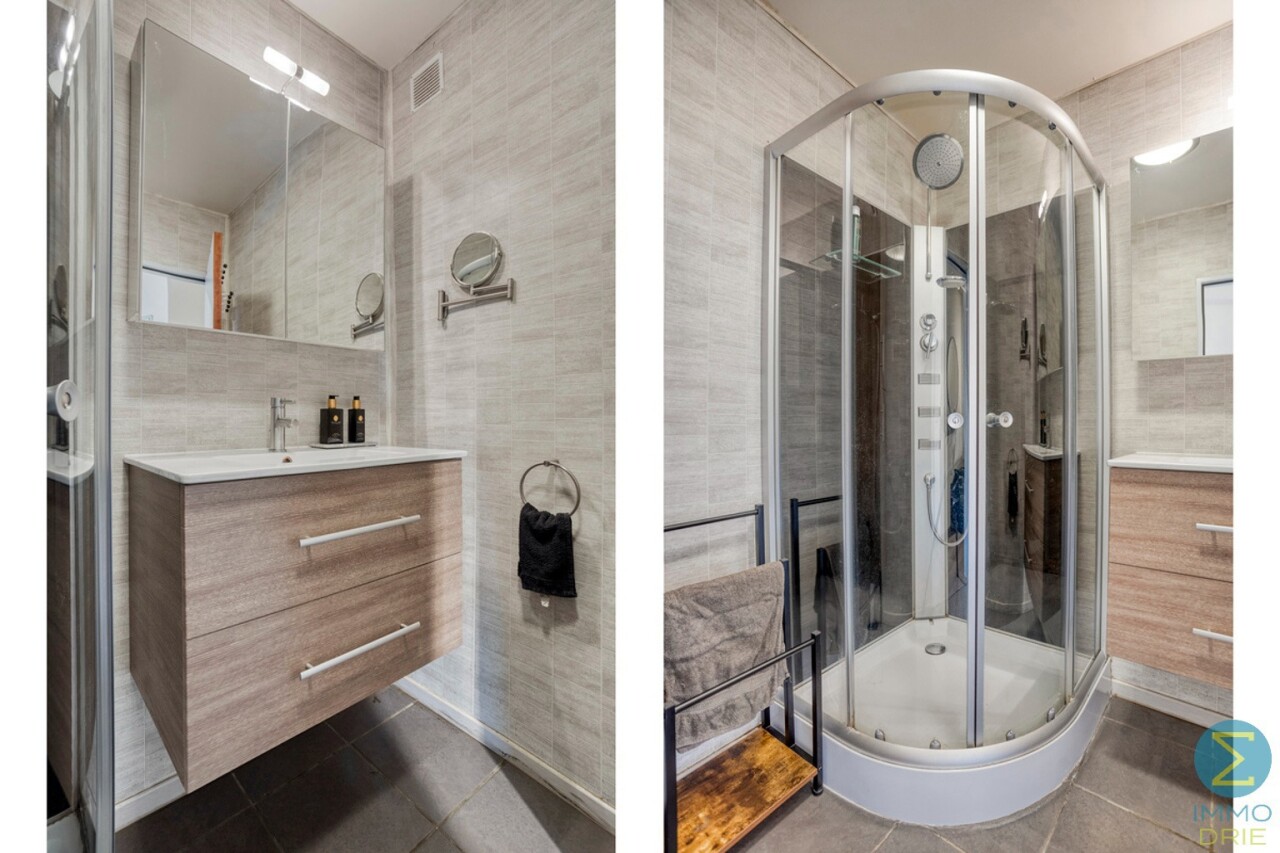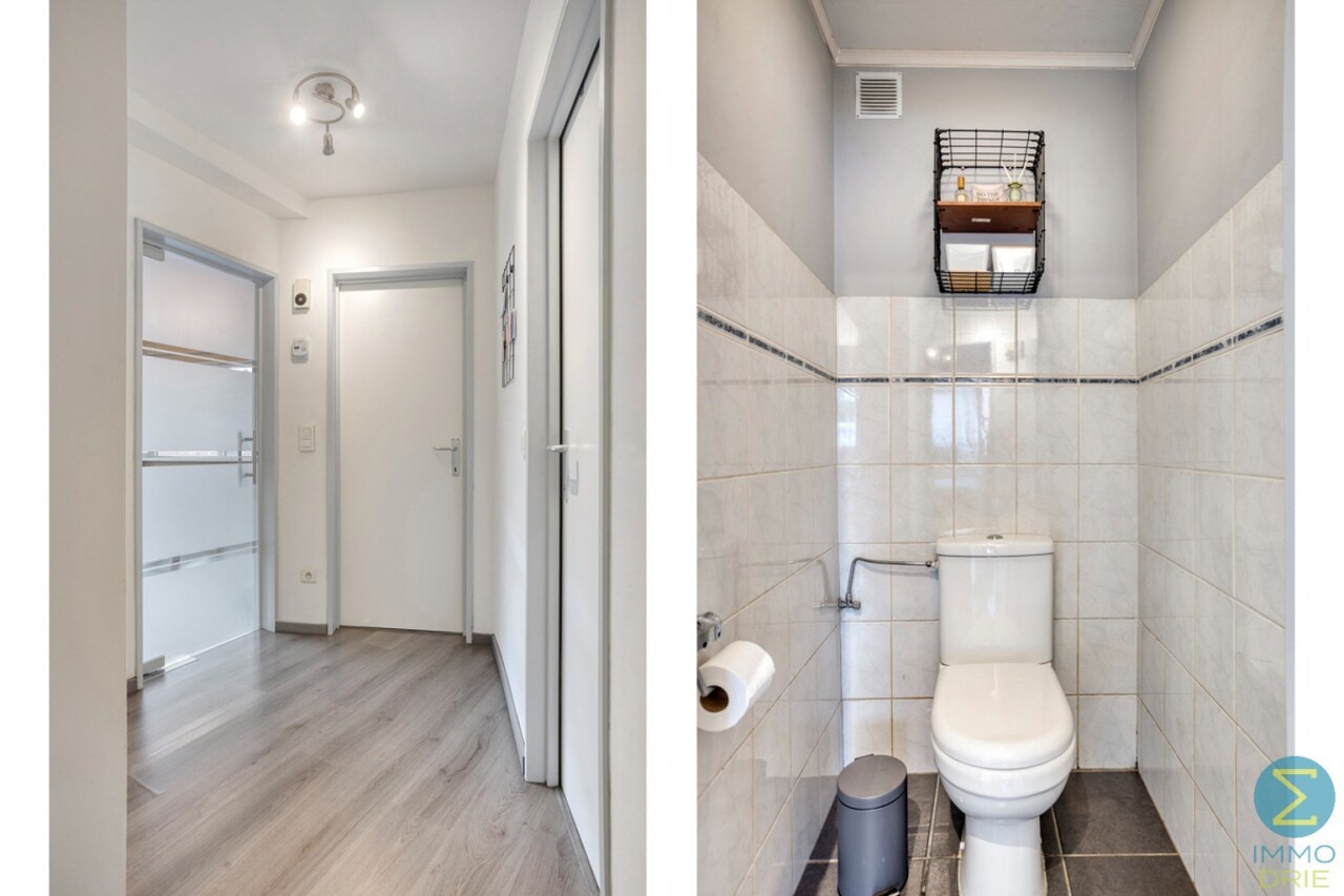 Verder geeft de hal toegang tot de ruime slaapkamer, de badkamer met douchecabine en badkamermeubel met enkele wastafel, en een apart toilet.