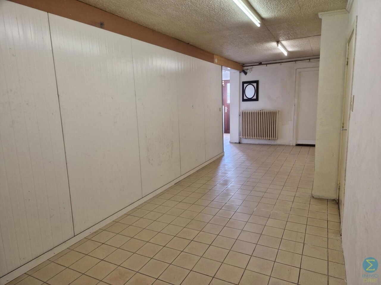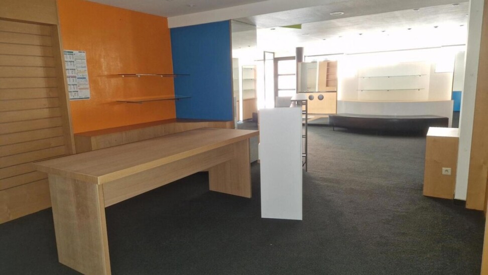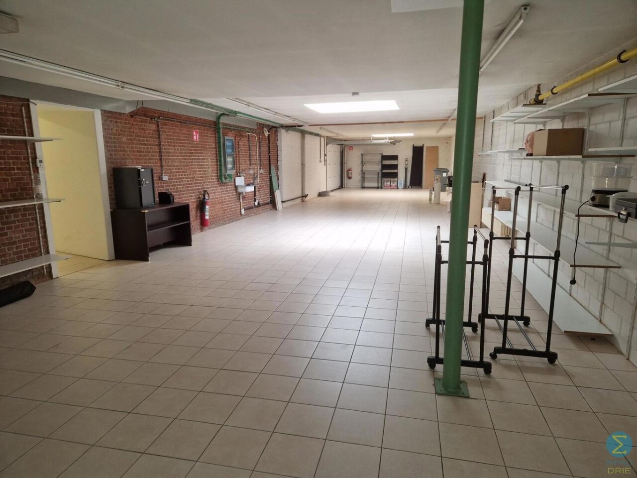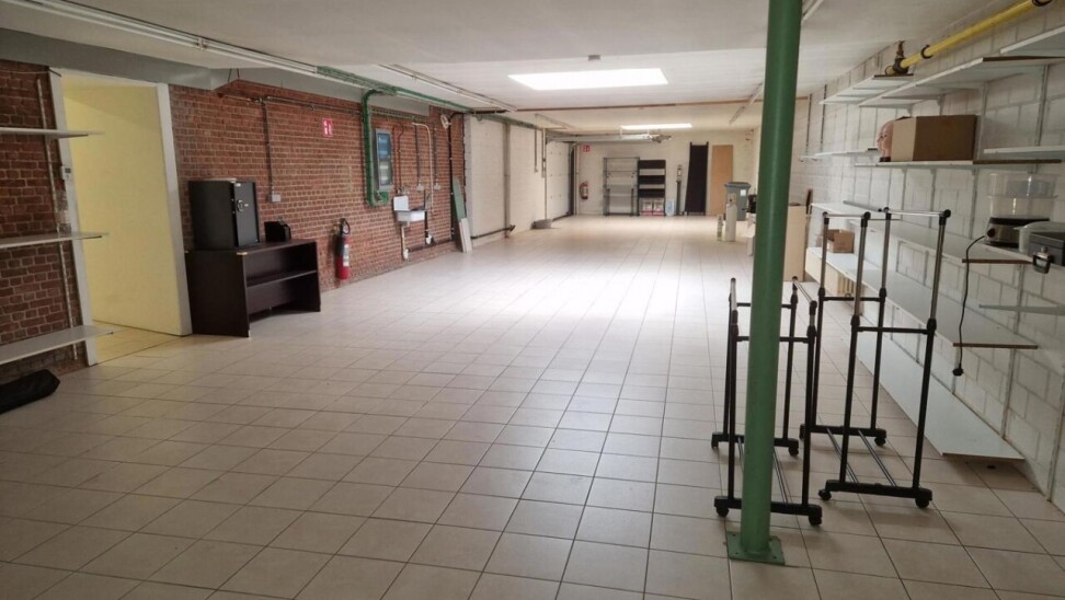 Handelsruimte (momenteel ingericht als schoenenzaak met paskamer), aanpalende grote opslagruimte (magazijn of kantoren), kleine kelder en keukentje. Laden en lossen van klein materiaal langs achter mogelijk.