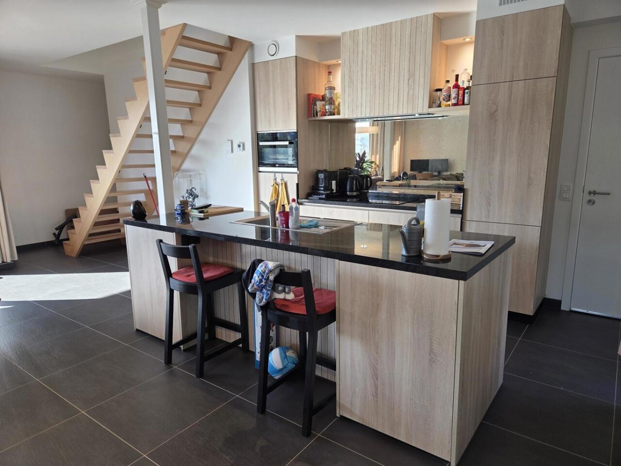 Ontdek dit ruim en lichtrijk duplexappartement met een aangename indeling en moderne voorzieningen. Bij het binnenkomen komt u in de royale woonkamer, die dankzij het hoge plafond een bijzonder ruimtelijk gevoel creëert. De leefruimte sluit naadloos aan op de open, volledig geïnstalleerde keuken. Deze is uitgerust met een afwasmachine, gootsteen met vergiet, inductiekookplaat, dampkap, koelkast en vriezer.