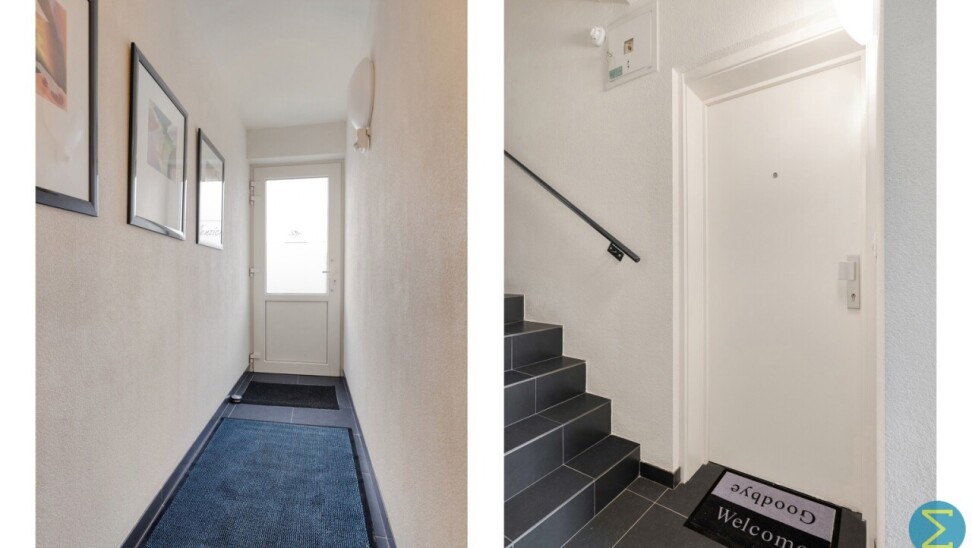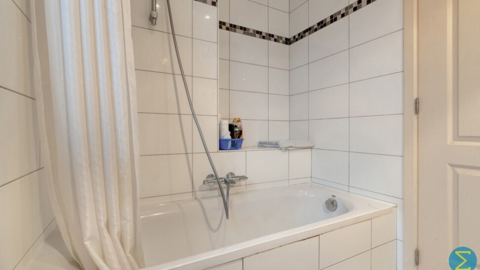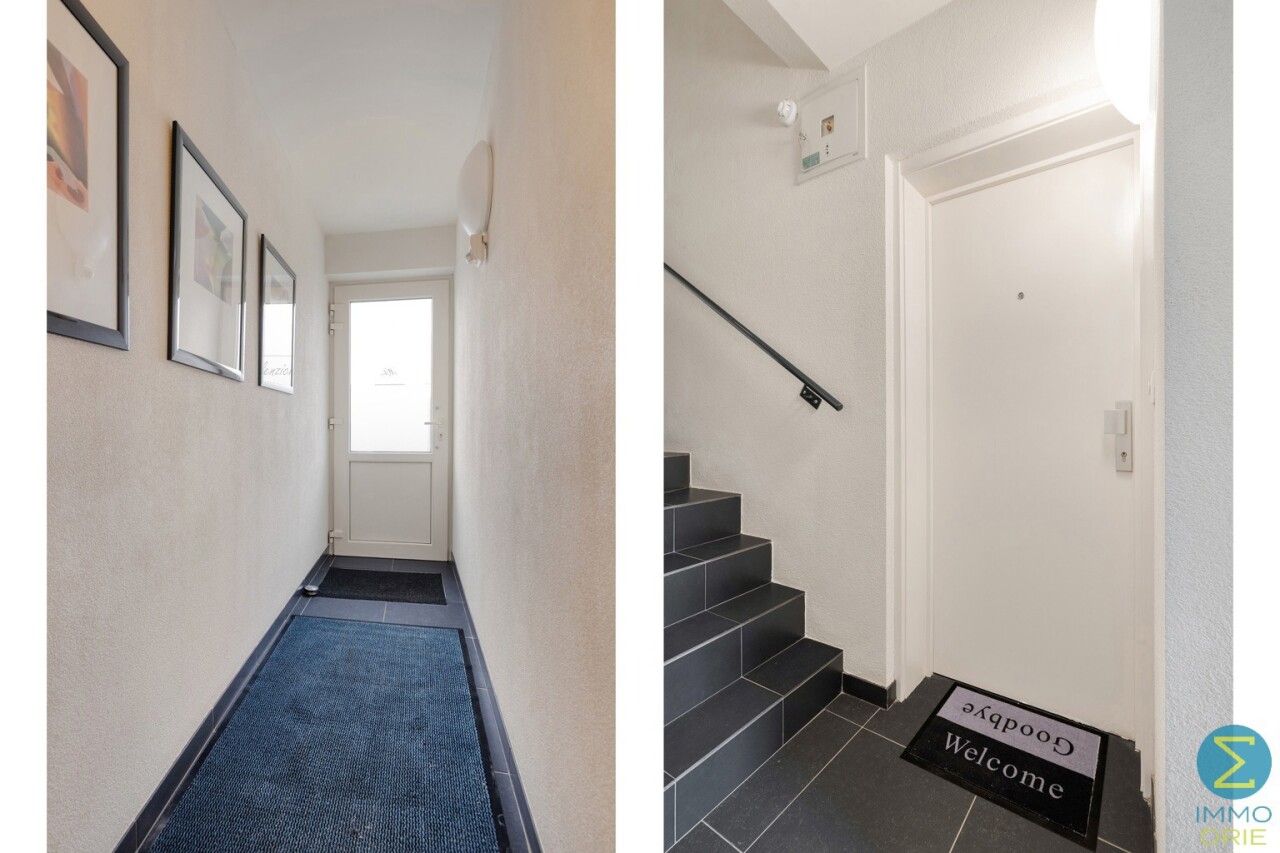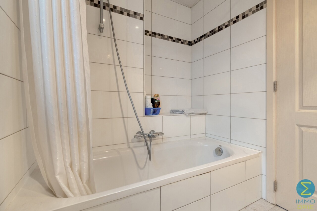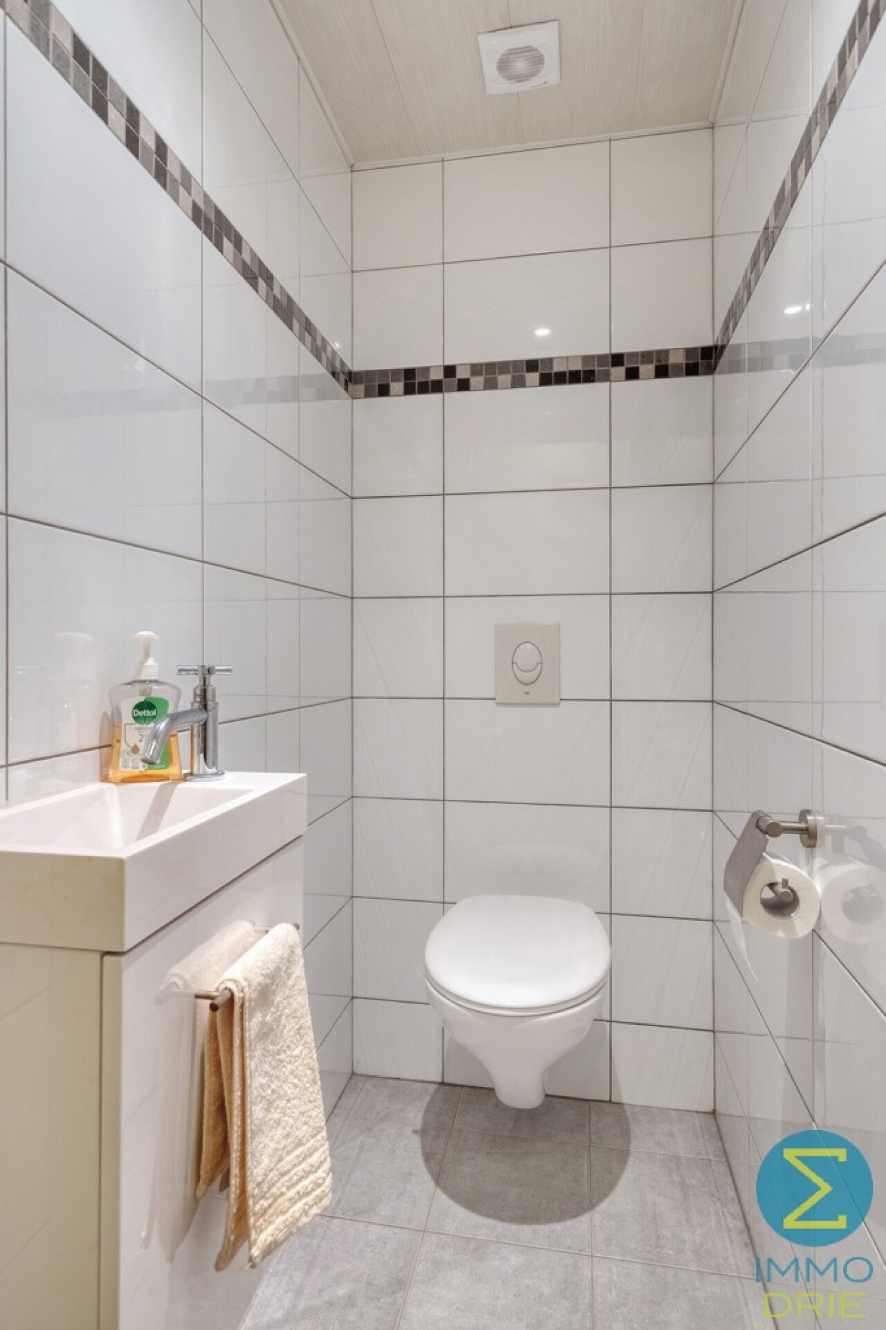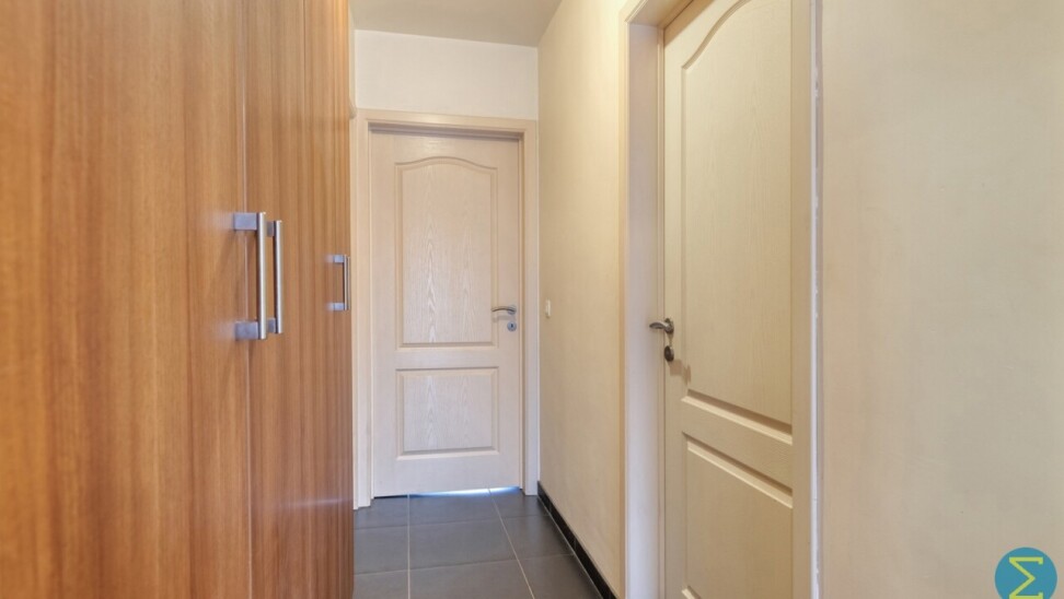 De inkomhal met centrale gang en inbouwkast geeft toegang tot een apart toilet, de slaapkamers dewelke zich aan de straatzijde bevinden, de badkamer met ligbad en wastafelmeubel en de berging/wasruimte.