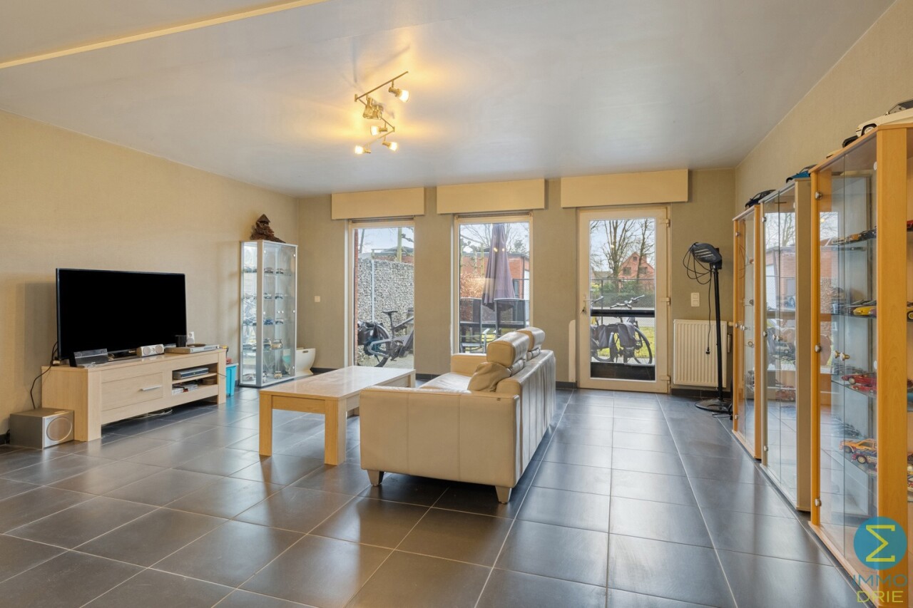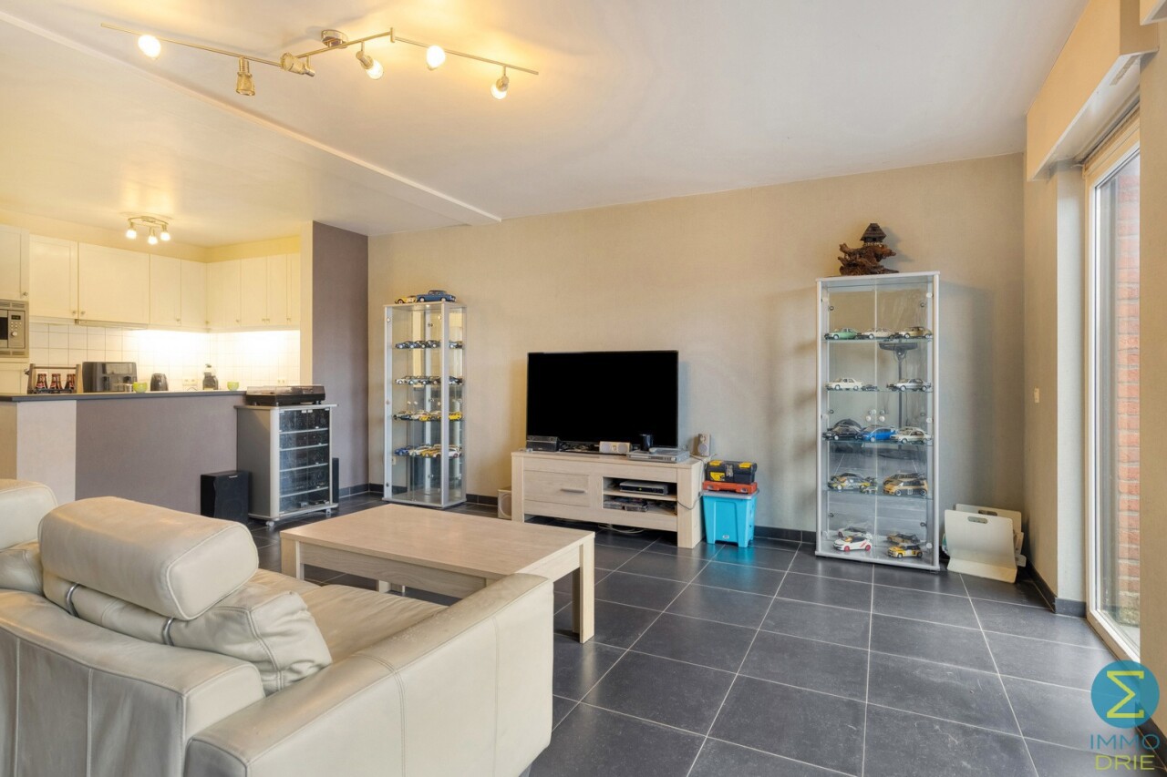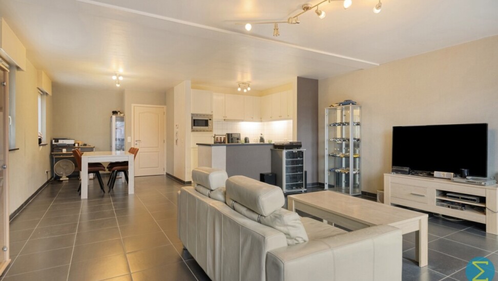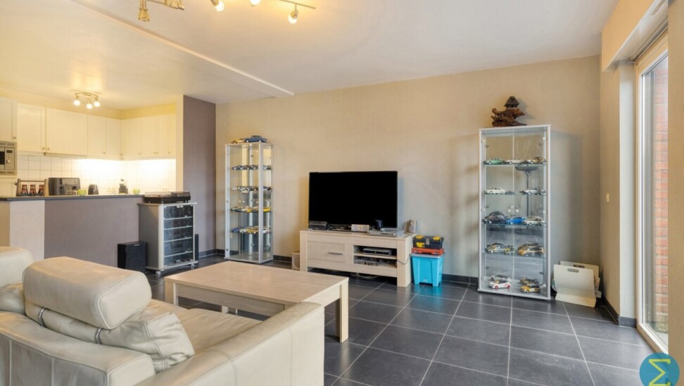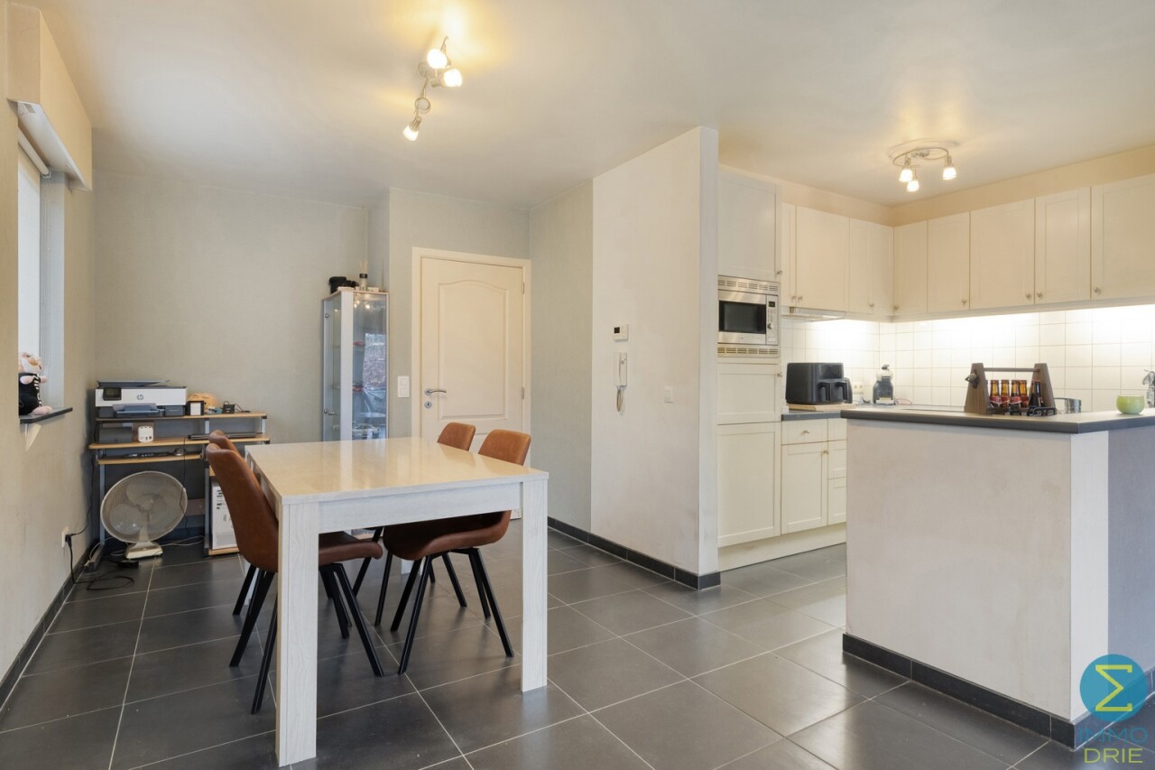 Verder leidt de gang naar de ruime woonkamer met open keuken, die is voorzien van de nodige apparatuur, en achteraan doorgang verschaft naar het terras met afgesloten tuin en poortje, waarlangs men makkelijk de achterliggende garagebox bereikt.