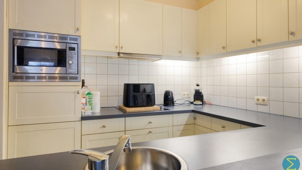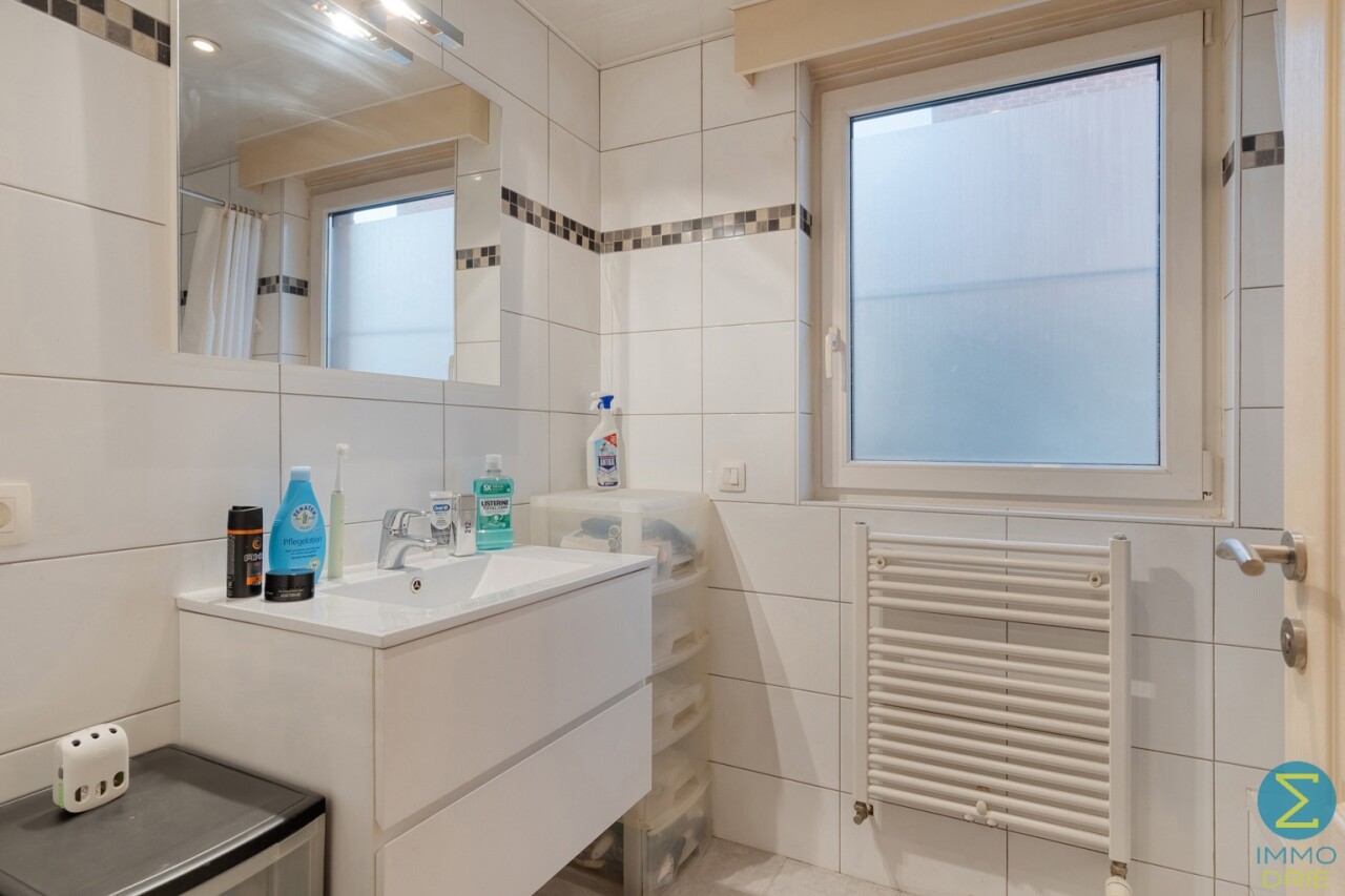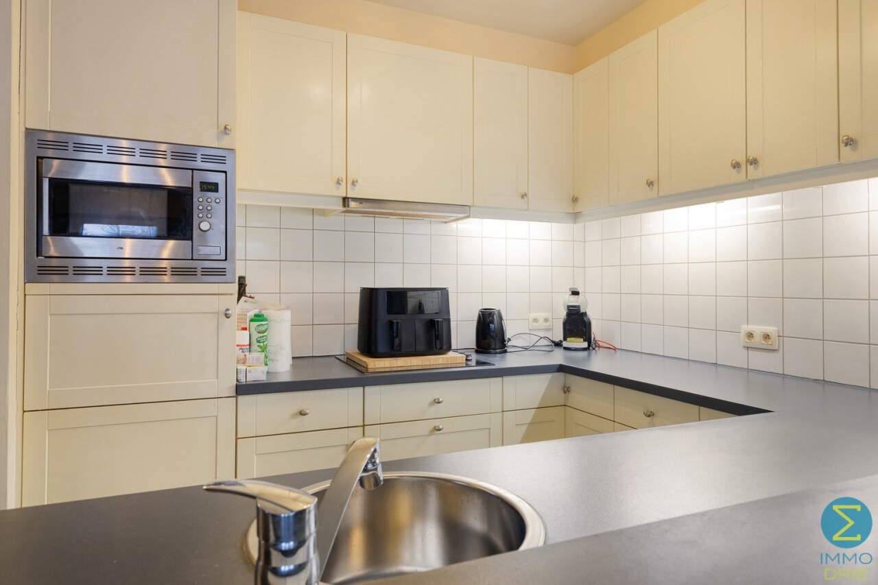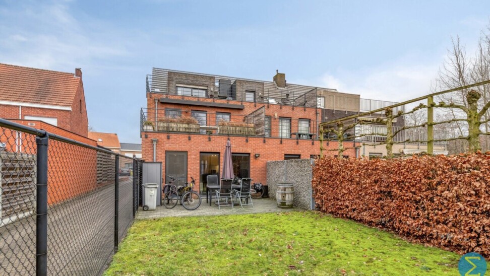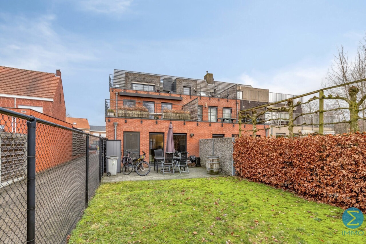 Verder leidt de gang naar de ruime woonkamer met open keuken, die is voorzien van de nodige apparatuur, en achteraan doorgang verschaft naar het terras met afgesloten tuin en poortje, waarlangs men makkelijk de achterliggende garagebox bereikt.