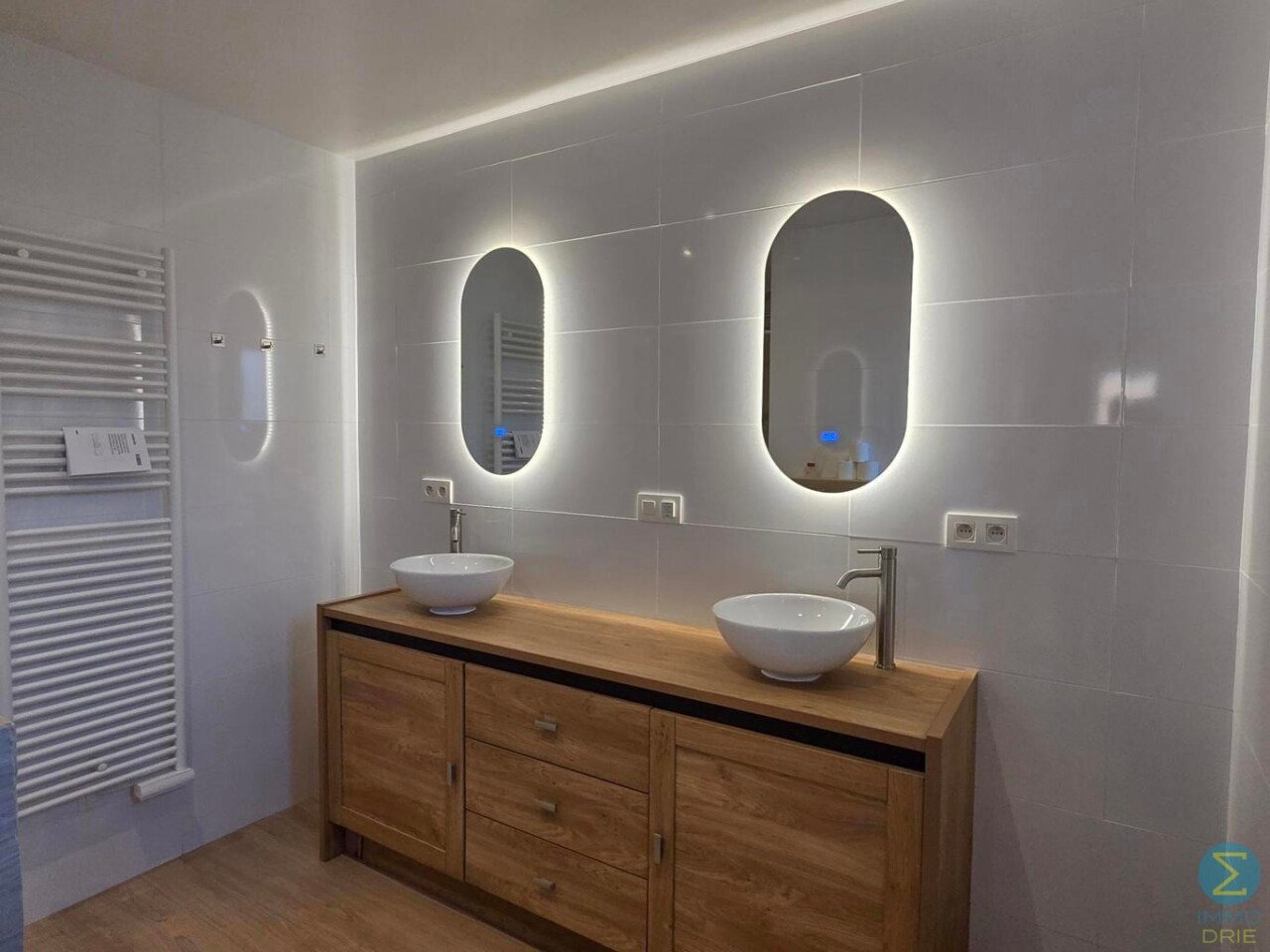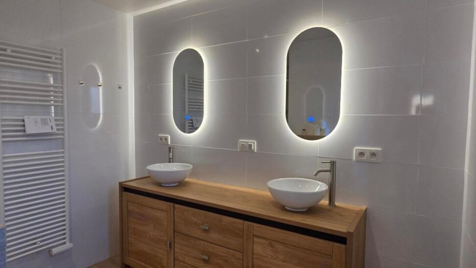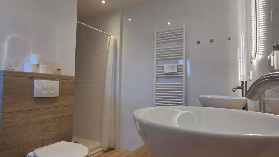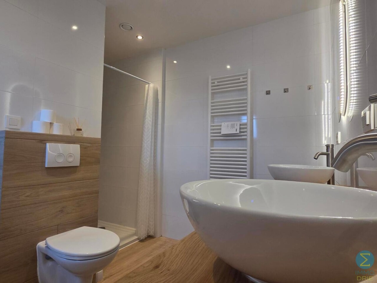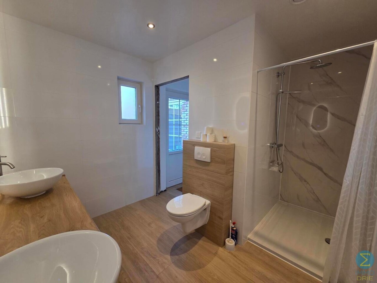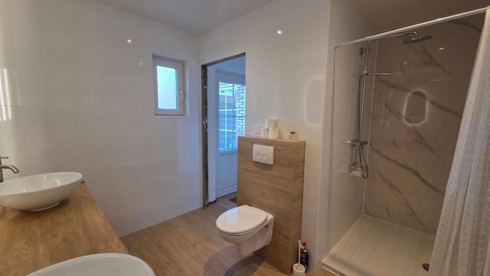 Op het gelijkvloers bevindt zich verder nog een stijlvolle badkamer, uitgerust met een inloopdouche, een badkamermeubel met dubbele wastafel en een extra toilet.