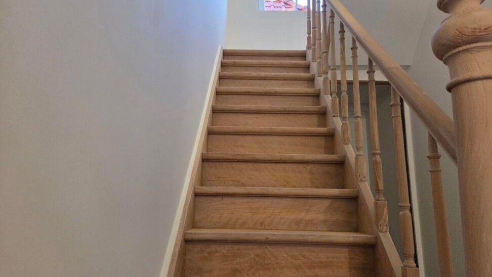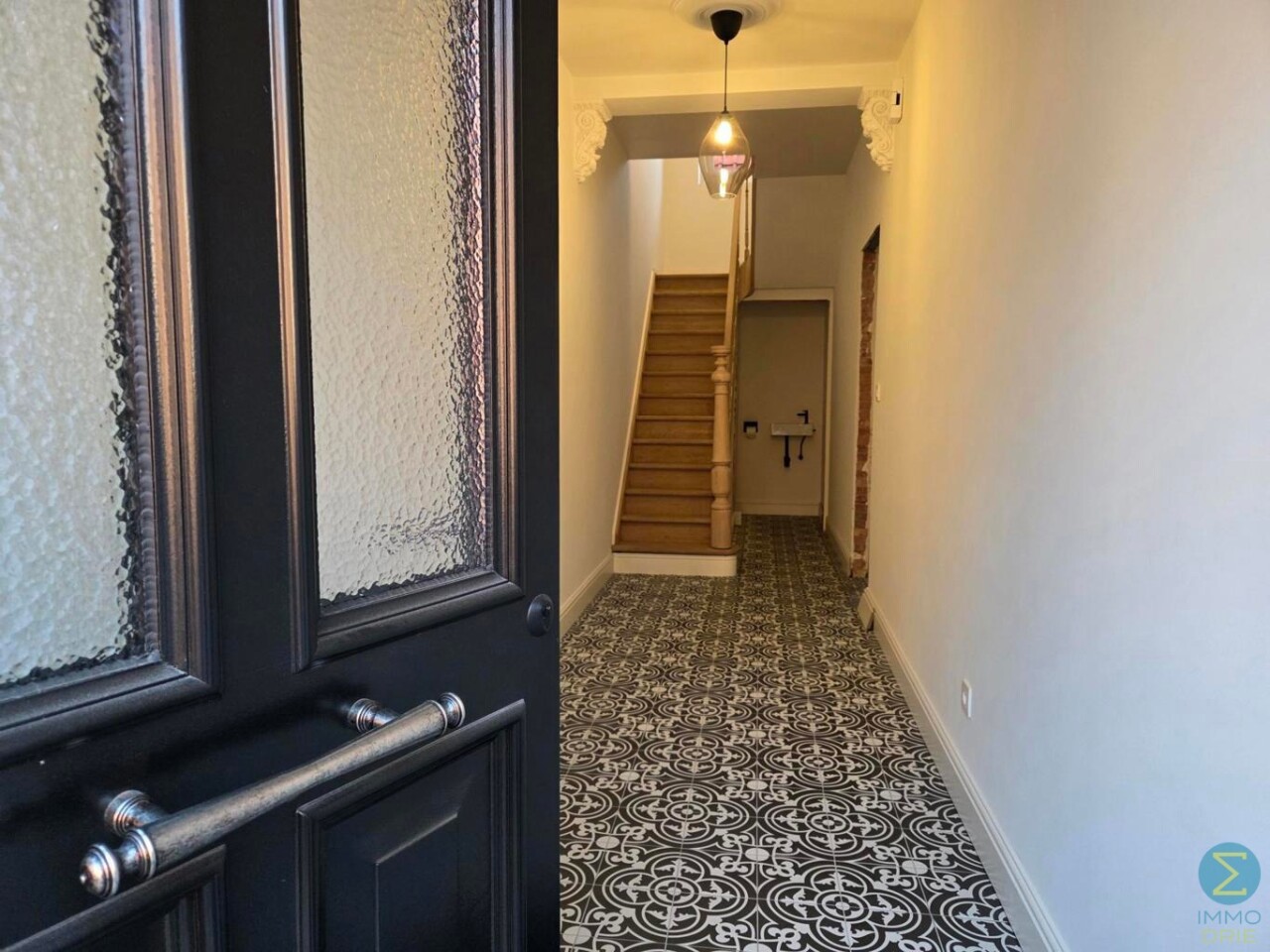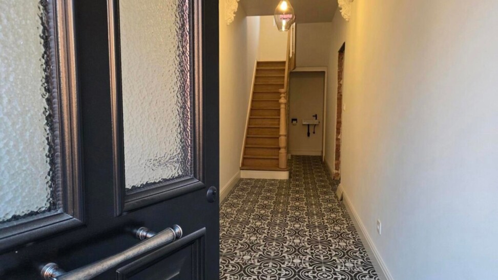 We betreden de woning via de inkomhal, waar meteen het authentieke karakter opvalt dankzij de mooie plafondafwerking en stijlvolle tegelvloer. De originele trap, die gezandstraald werd om zijn charme te behouden, leidt naar de eerste verdieping. In de hal bevinden zich ook een apart gastentoilet en de toegang tot de leefruimte.