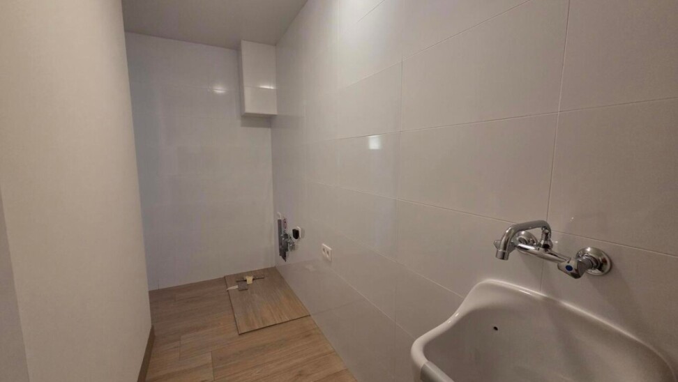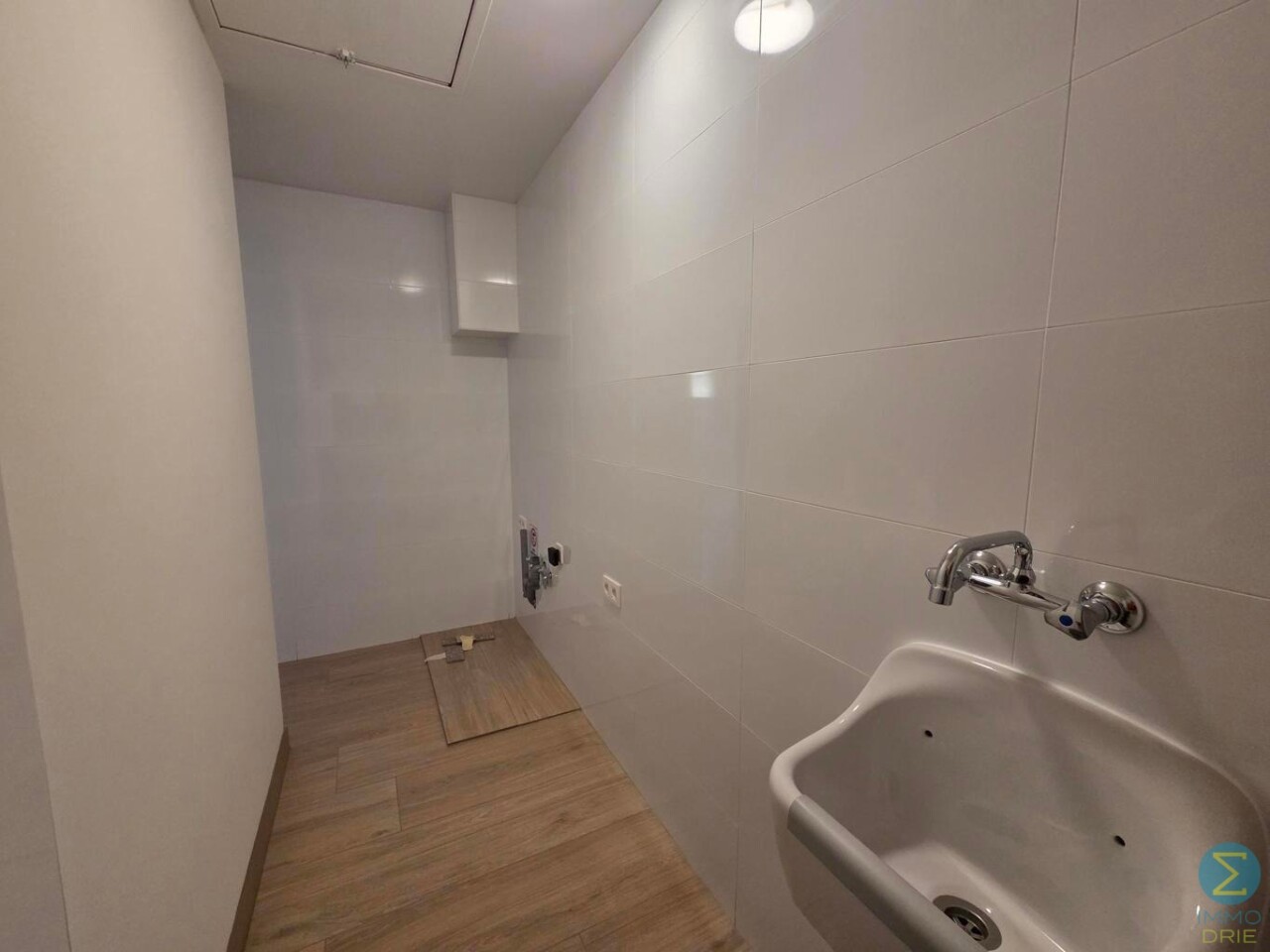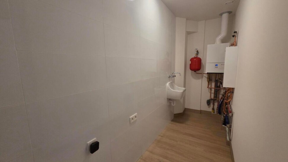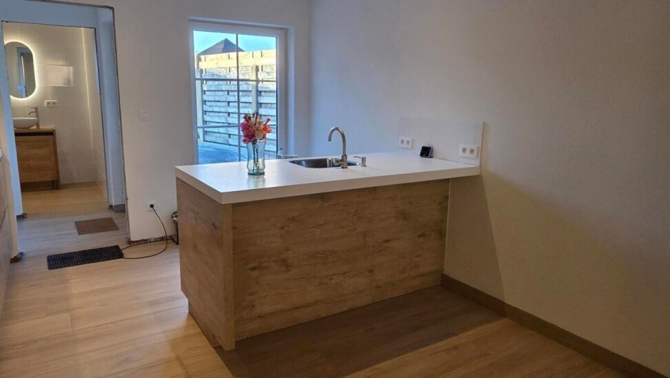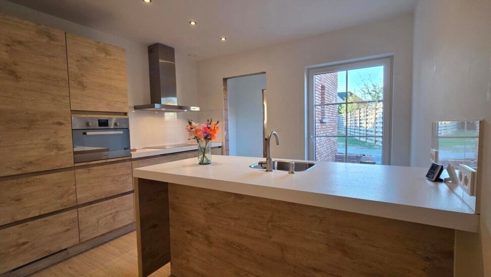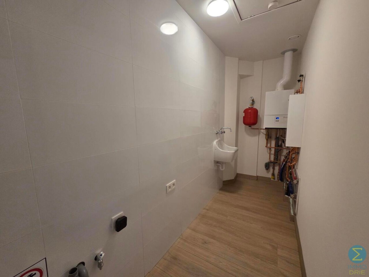 De open leefruimte biedt dankzij haar indeling en lichtinval tal van mogelijkheden om deze volledig naar eigen smaak in te richten. Aansluitend vinden we de moderne open keuken met praktisch werkeiland, uitgerust met alle hedendaagse comfort (exclusief vaatwasser). Deze kan eenvoudig geïnstalleerd worden in de ruime, naastgelegen voorraadberging, waar zich ook de technische installaties en aansluiting voor de wasmachine bevinden. Via de achteringang is er bovendien ruimte voorzien voor een vestiaire of schoenenkast.
