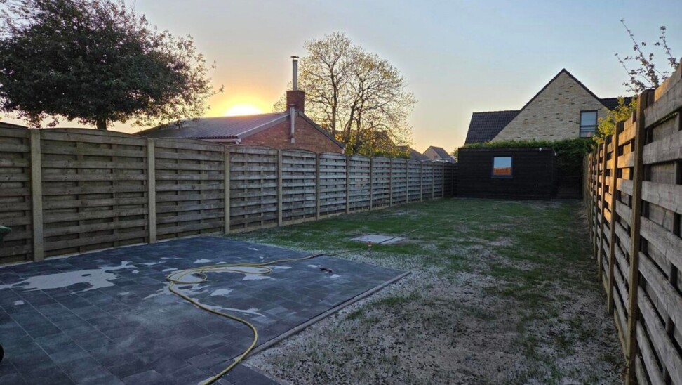De tuin is noordwest georiënteerd en combineert een aangenaam terras van ca. 12 m² met een onderhoudsvriendelijk gazon van ca. 140 m². Achteraan de tuin bevindt zich een praktische en ruime tuinberging.