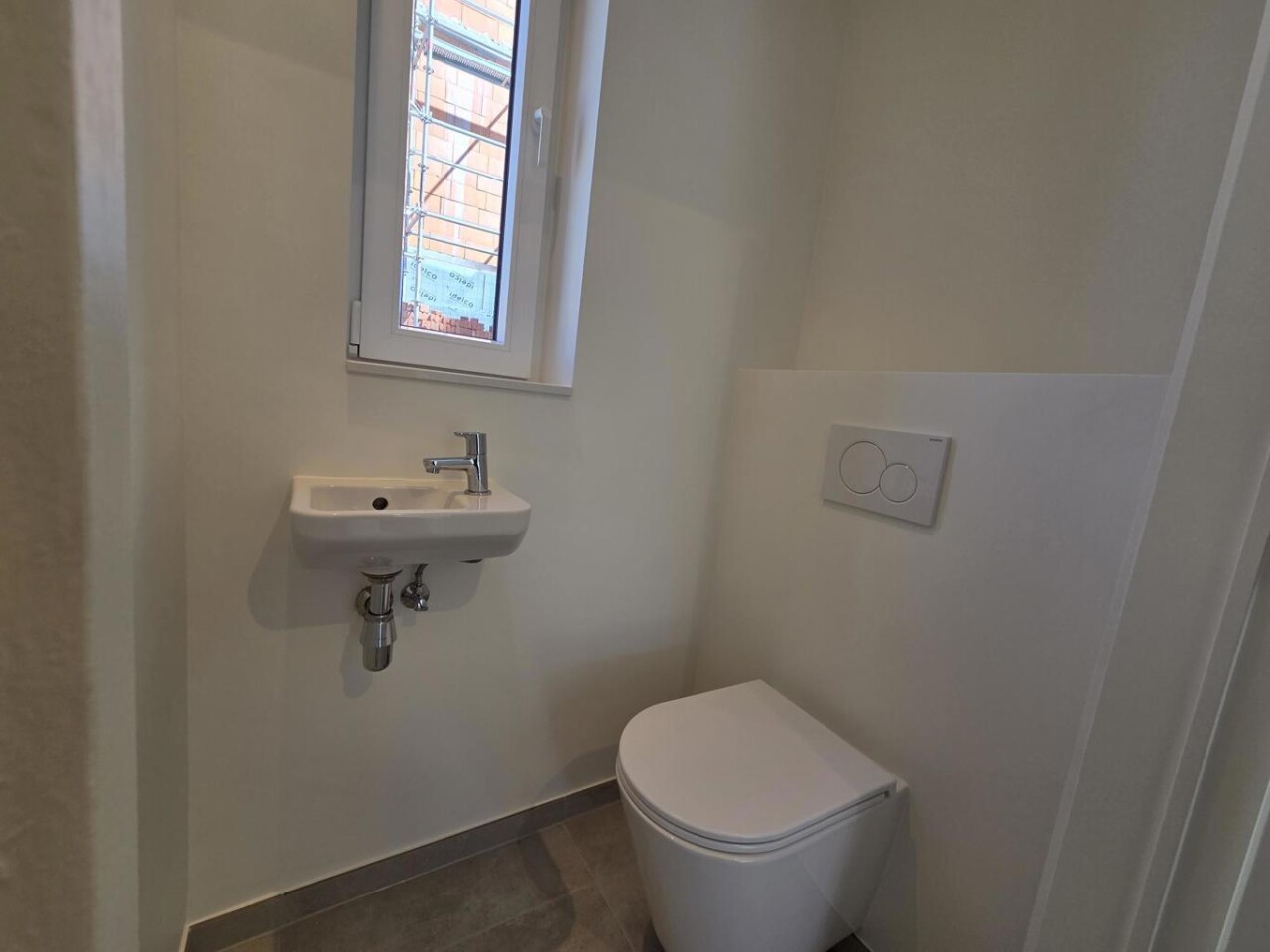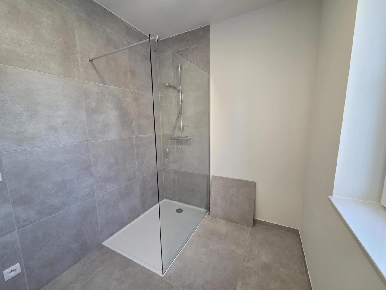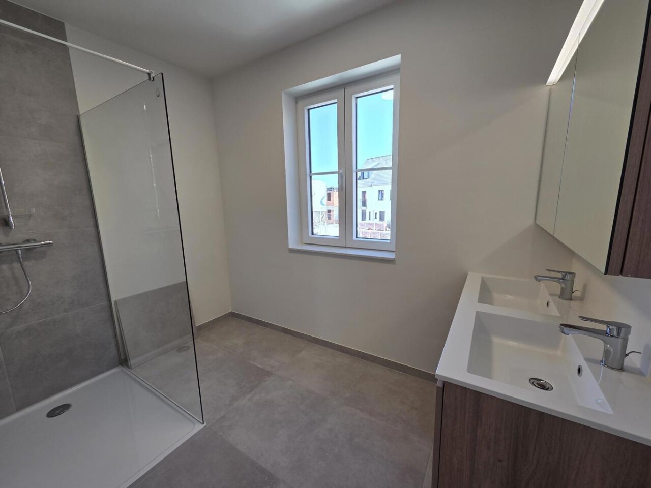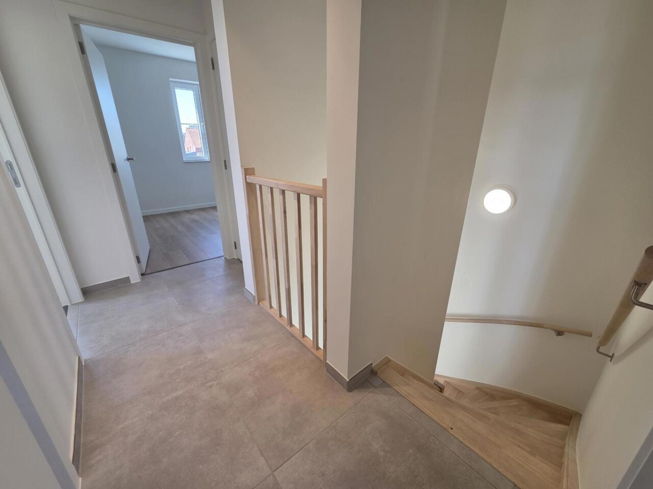 Via de houten trap bereiken we de eerste verdieping. Hier bevinden zich drie volwaardige slaapkamers, een apart toilet en een moderne badkamer uitgerust met een inloopdouche en een badkamermeubel met dubbele wastafel. Alle ruimtes zijn vlot bereikbaar via een centrale gang.