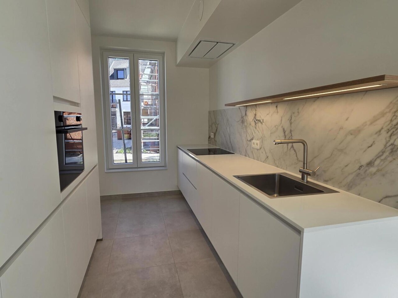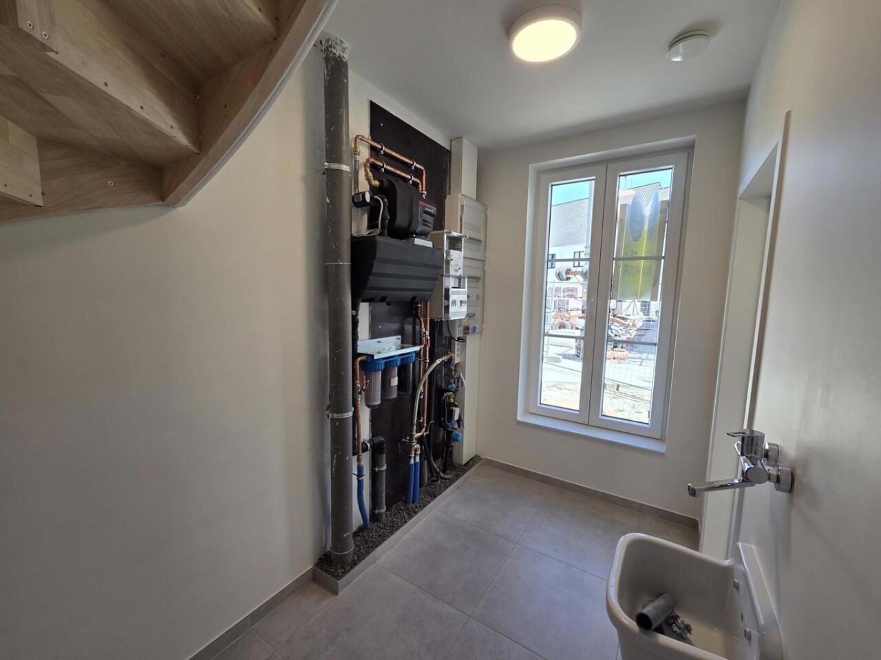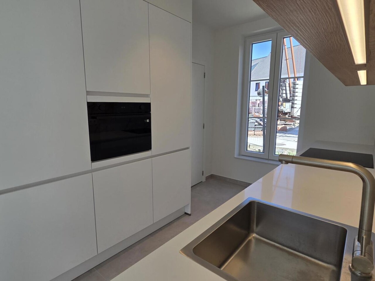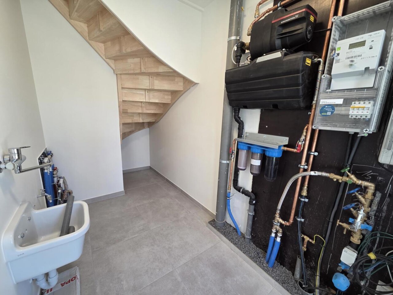 Aansluitend op de leefruimte bevindt zich de volledig uitgeruste open keuken, voorzien van alle hedendaags comfort zoals een inductiekookplaat, vaatwasser, combi-oven en voldoende opbergruimte. Naast de keuken vinden we een praktische berging, ideaal voor dagelijkse opslag, met aansluiting voor een wasmachine en waar ook de technische installaties van de woning zijn ondergebracht.