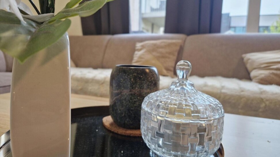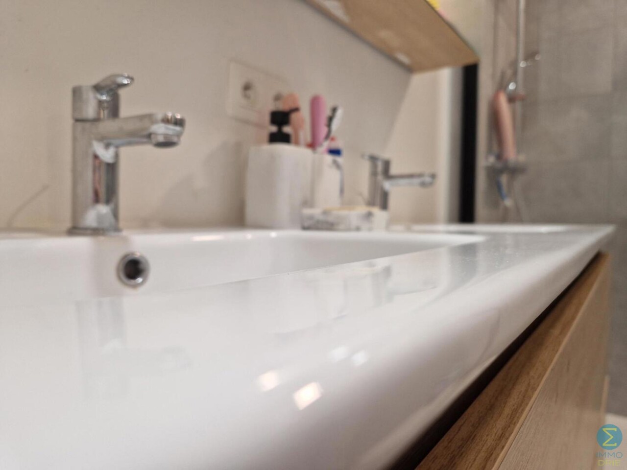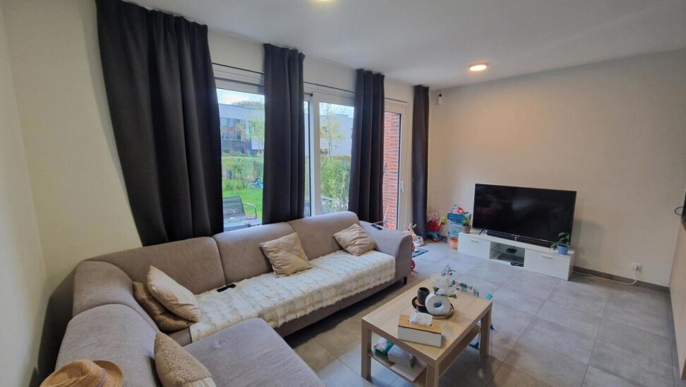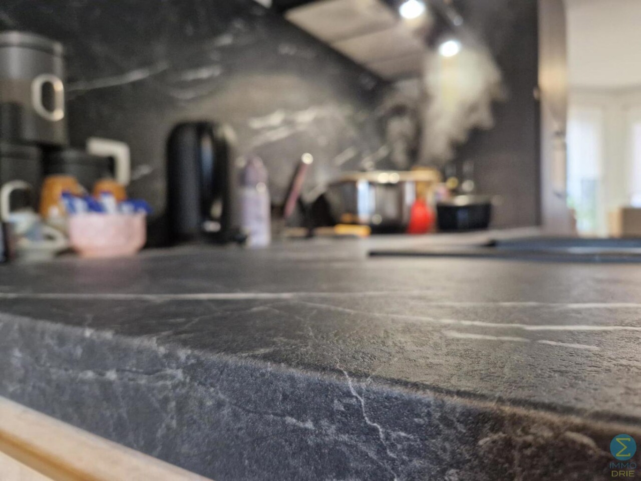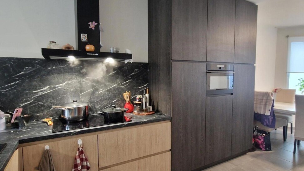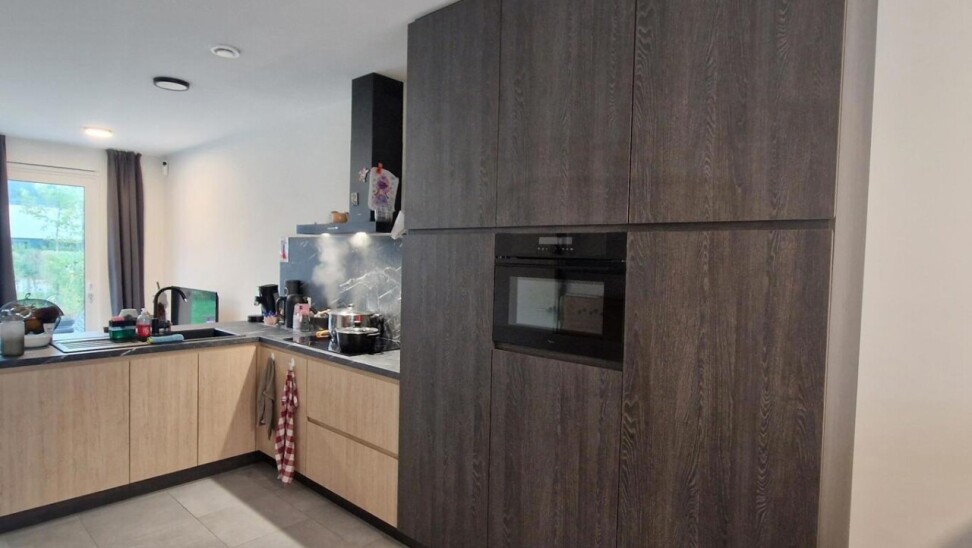 De leefruimte vormt één geheel met de eetkamer en de volledig uitgeruste leefkeuken. Deze keuken is afgewerkt met kwalitatieve materialen en voorzien van alle moderne comfort – een combinatie van stijl, functionaliteit en duurzaamheid.