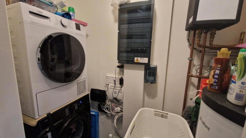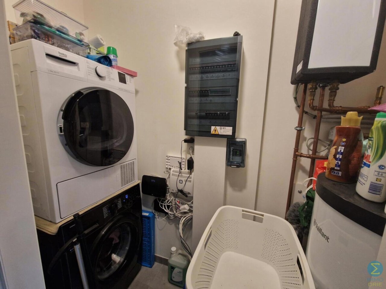 Aan de keuken grenst een praktische berging, ingericht als technische ruimte met aansluitingen voor wasmachine en droogkast.