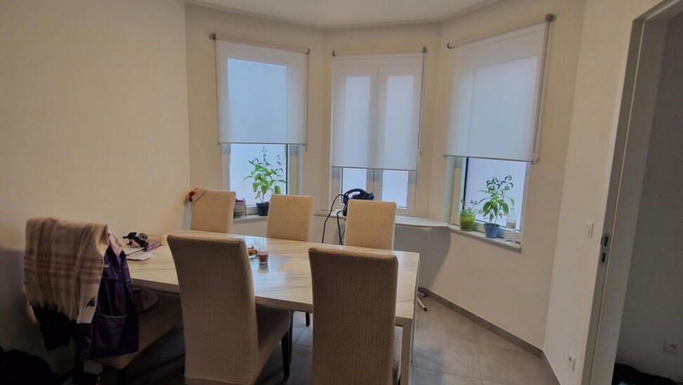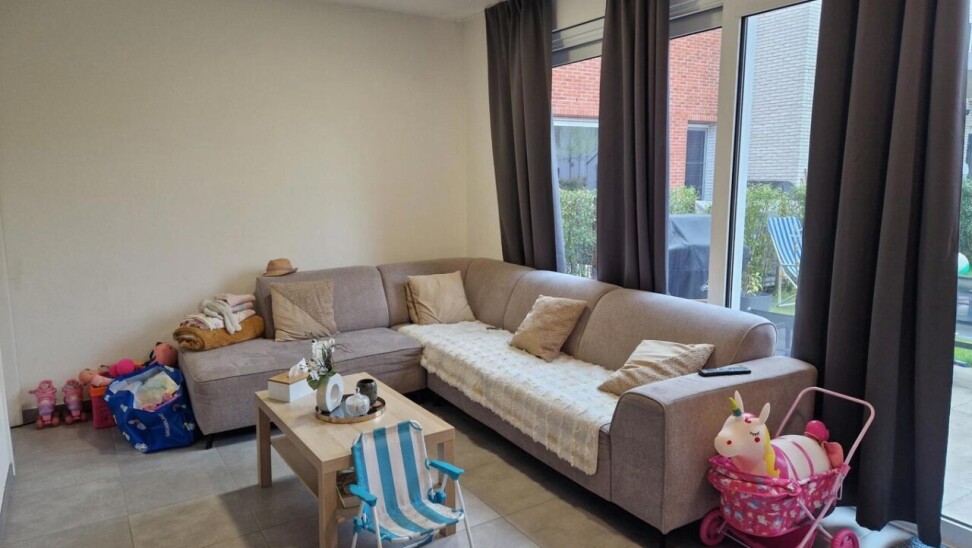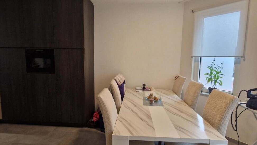 De leefruimte vormt één geheel met de eetkamer en de volledig uitgeruste leefkeuken. Deze keuken is afgewerkt met kwalitatieve materialen en voorzien van alle moderne comfort – een combinatie van stijl, functionaliteit en duurzaamheid.