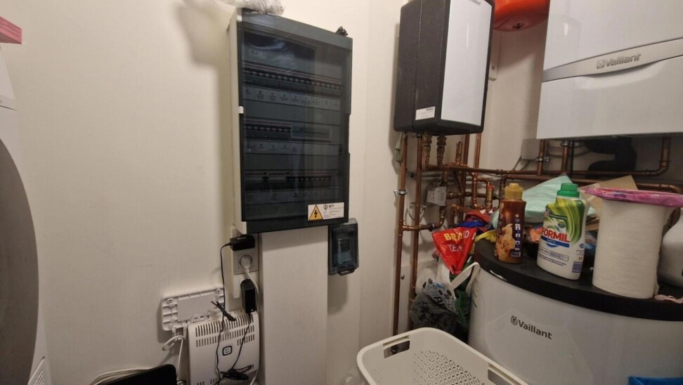Aan de keuken grenst een praktische berging, ingericht als technische ruimte met aansluitingen voor wasmachine en droogkast.