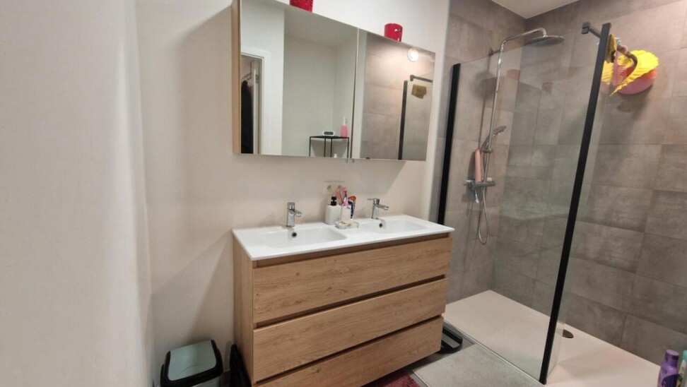 Op de eerste verdieping bevindt zich een ruime nachthal die toegang biedt tot drie volwaardige slaapkamers. De badkamer is modern en functioneel, uitgerust met een badkamermeubel met dubbele wastafel, een inloopdouche, en een apart toilet.