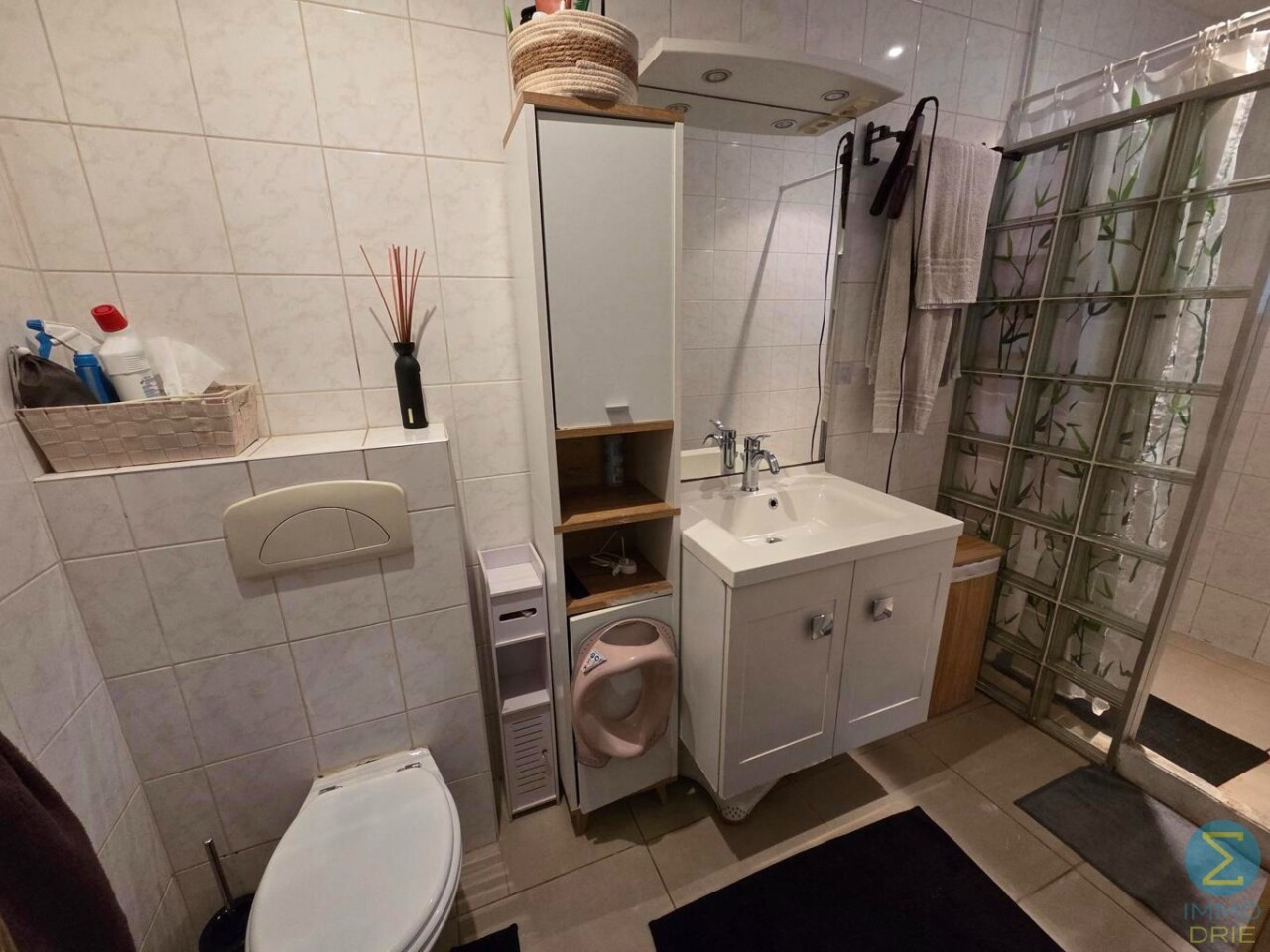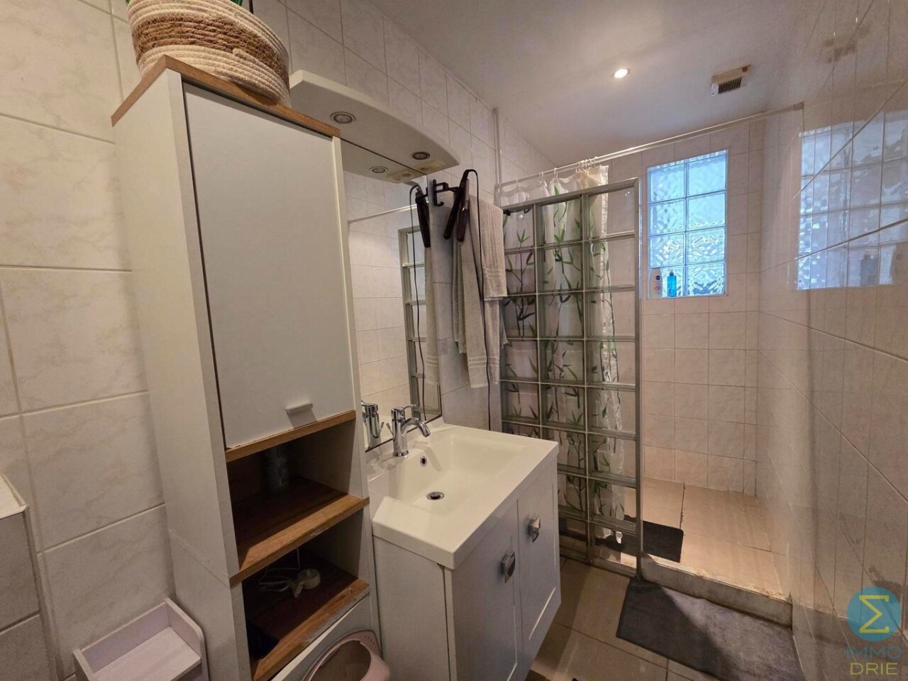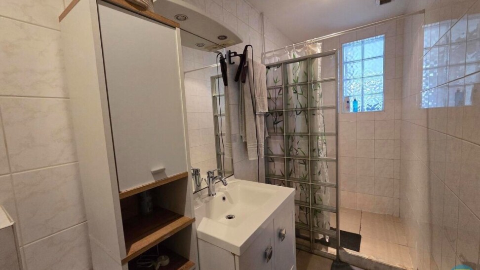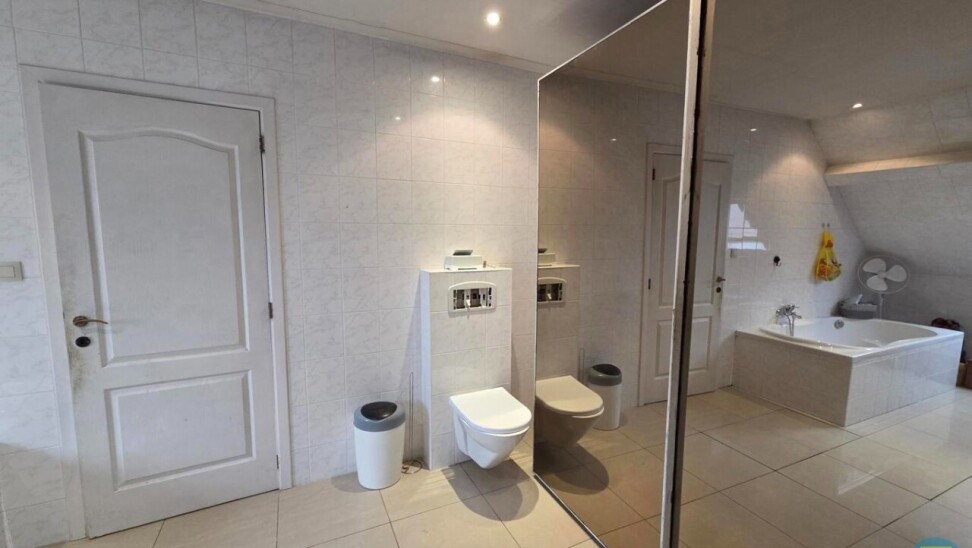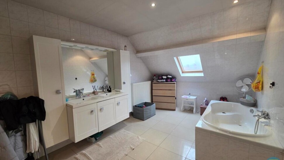 Bij het betreden van deze ruime halfopen bebouwing komt u terecht in een royale inkomhal die meteen een gevoel van openheid biedt. Hier vindt u een praktische badkamer met inloopdouche, een badkamermeubel met enkele wastafel en een gastentoilet.
