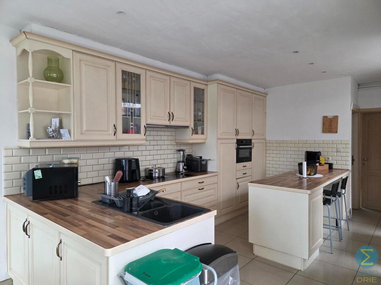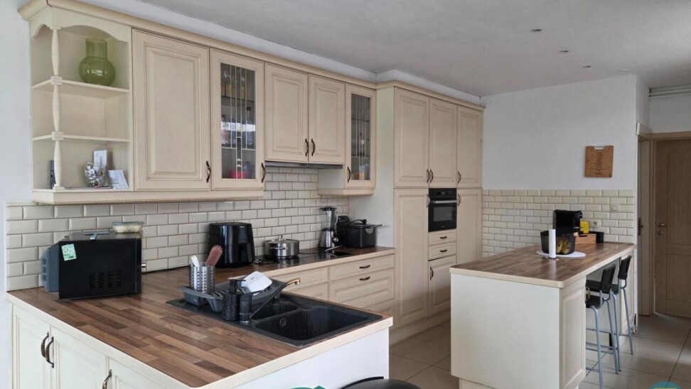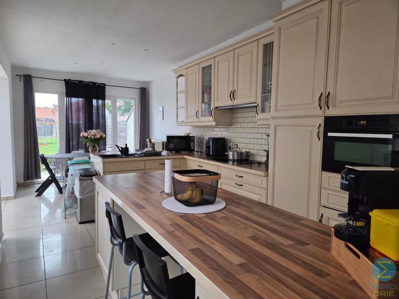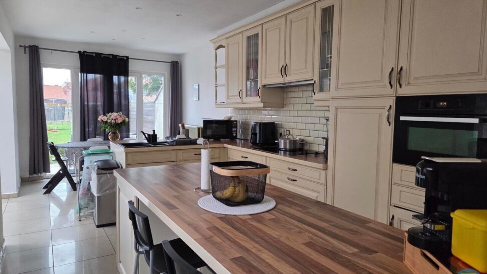 Vanuit de inkomhal loopt u door naar de lichtrijke leefruimte die overgaat in de keuken. Deze keuken is volledig uitgerust met alle hedendaagse comfort en biedt een aangenaam zicht op de ruime, noordwest georiënteerde tuin. Dankzij de indeling is er voldoende plaats voor zowel een gezellige ontbijthoek als een ruime eetkamer met plaats voor een grote eettafel.