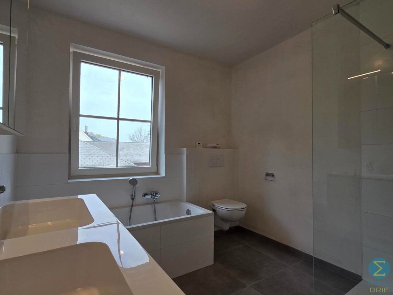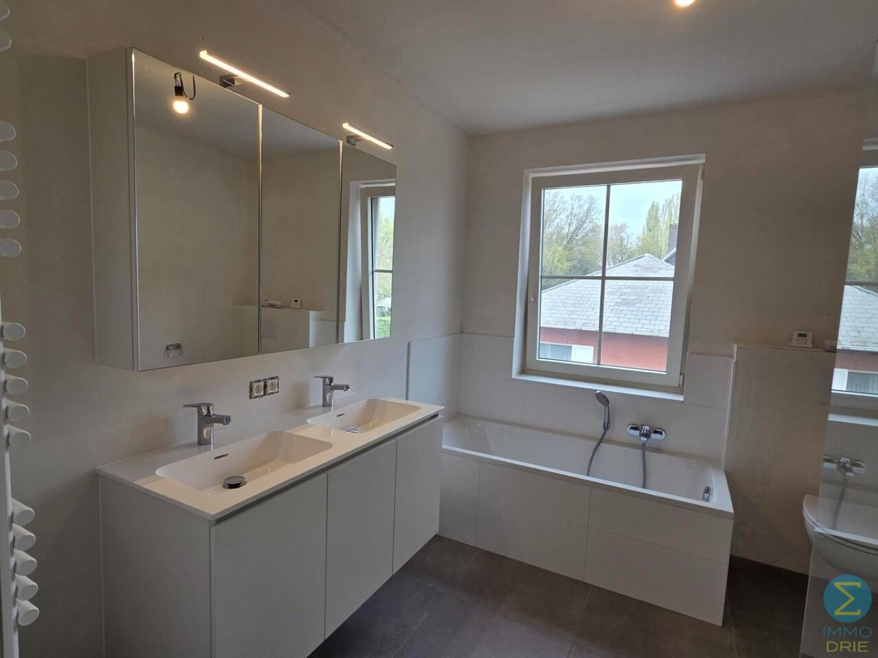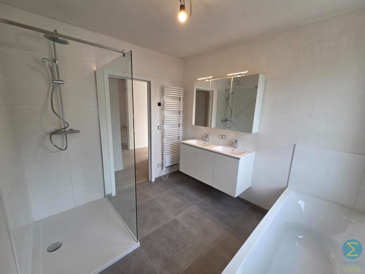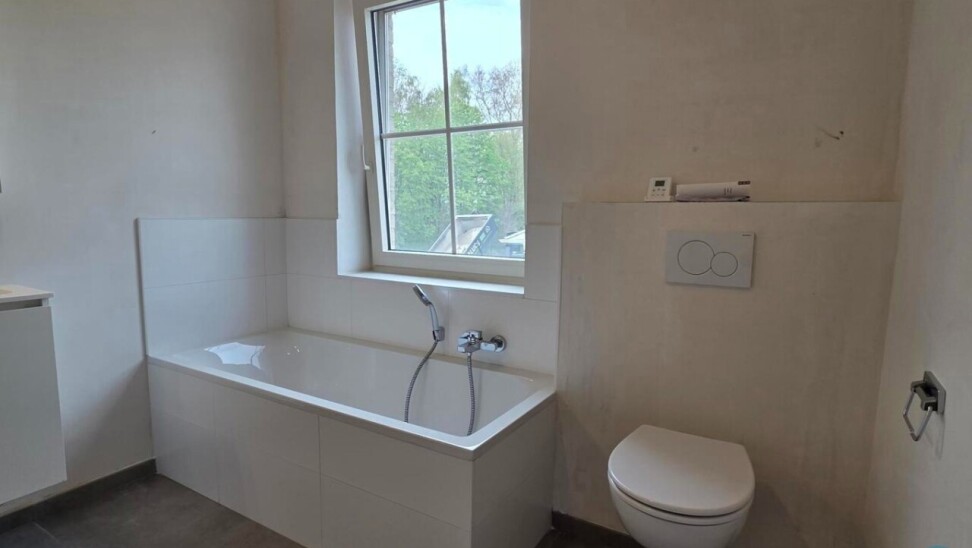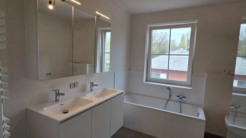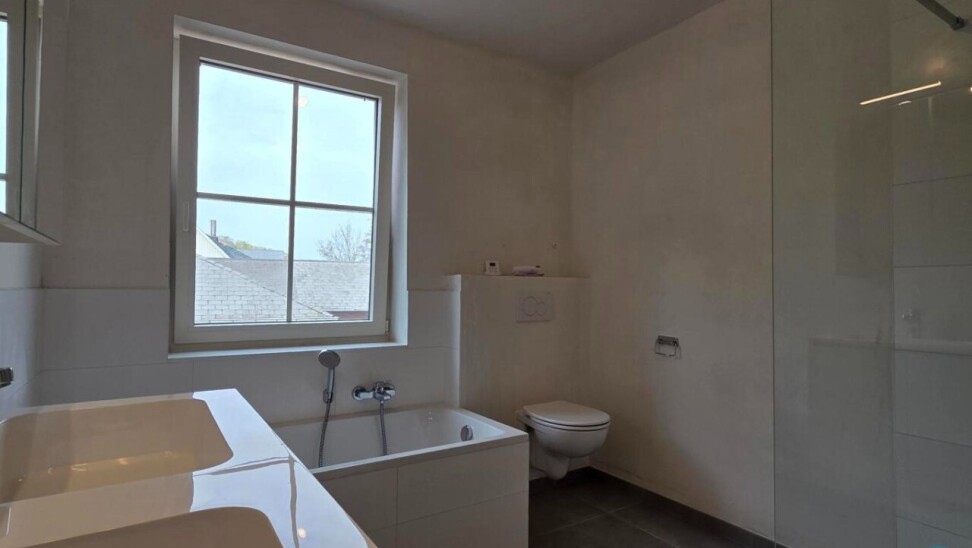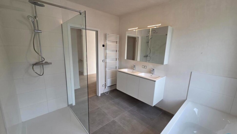 Op de eerste verdieping komen we via de nachthal bij drie volwaardige slaapkamers en een ruime badkamer, uitgerust met een douche, ligbad, toilet en een badkamermeubel met dubbele wastafel.