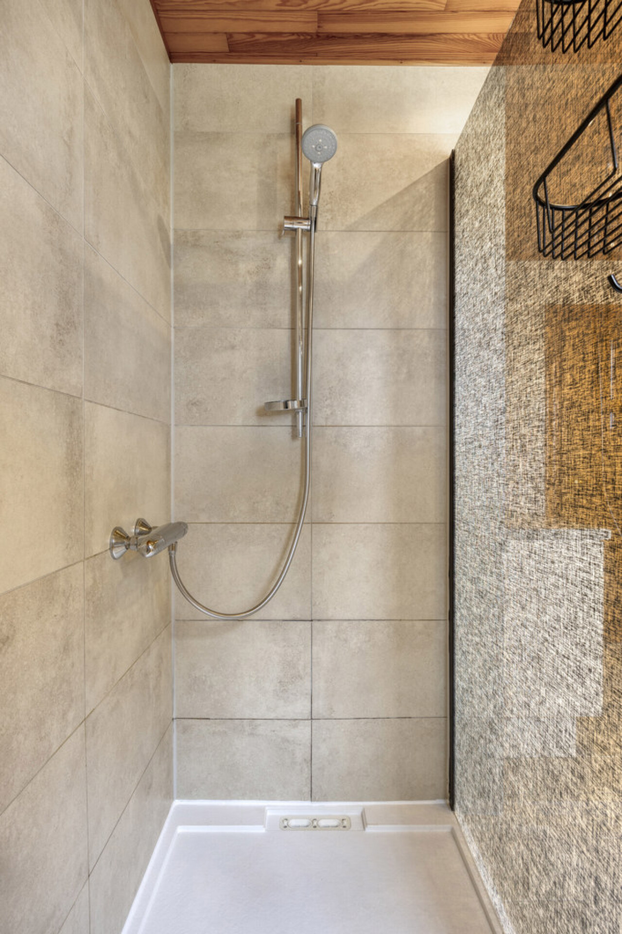 Verder treffen we nog een grote berging met zijingang, een apart toilet en de badkamer, die is uitgerust met een inloopdouche en een wastafelmeubel.