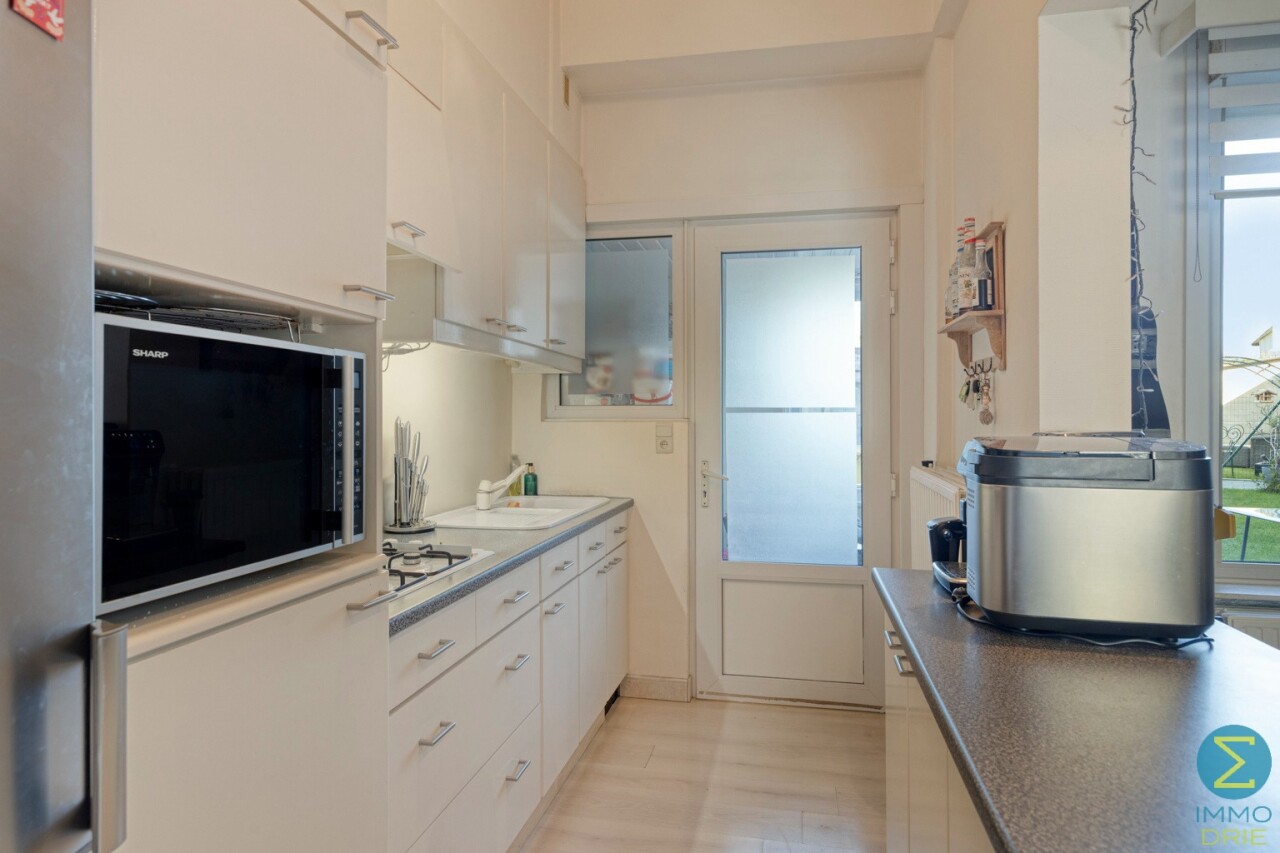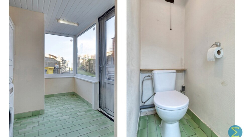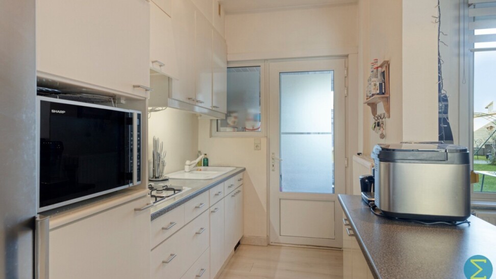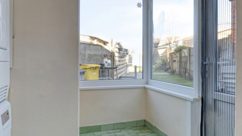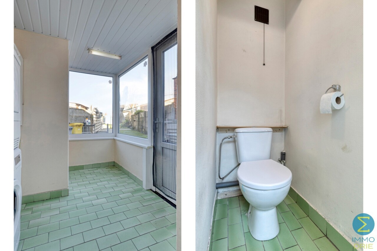 Vanuit de inkomhal komt men in woonkamer met open keuken en toegang tot de kelder. Achteraan treffen we nog een sas met apart toilet en ruimte voor de was- en droogmachine.