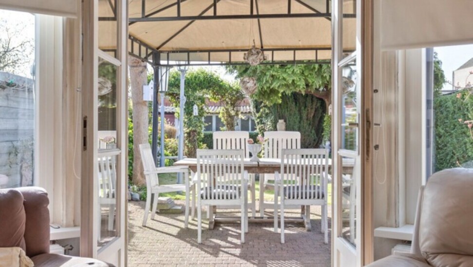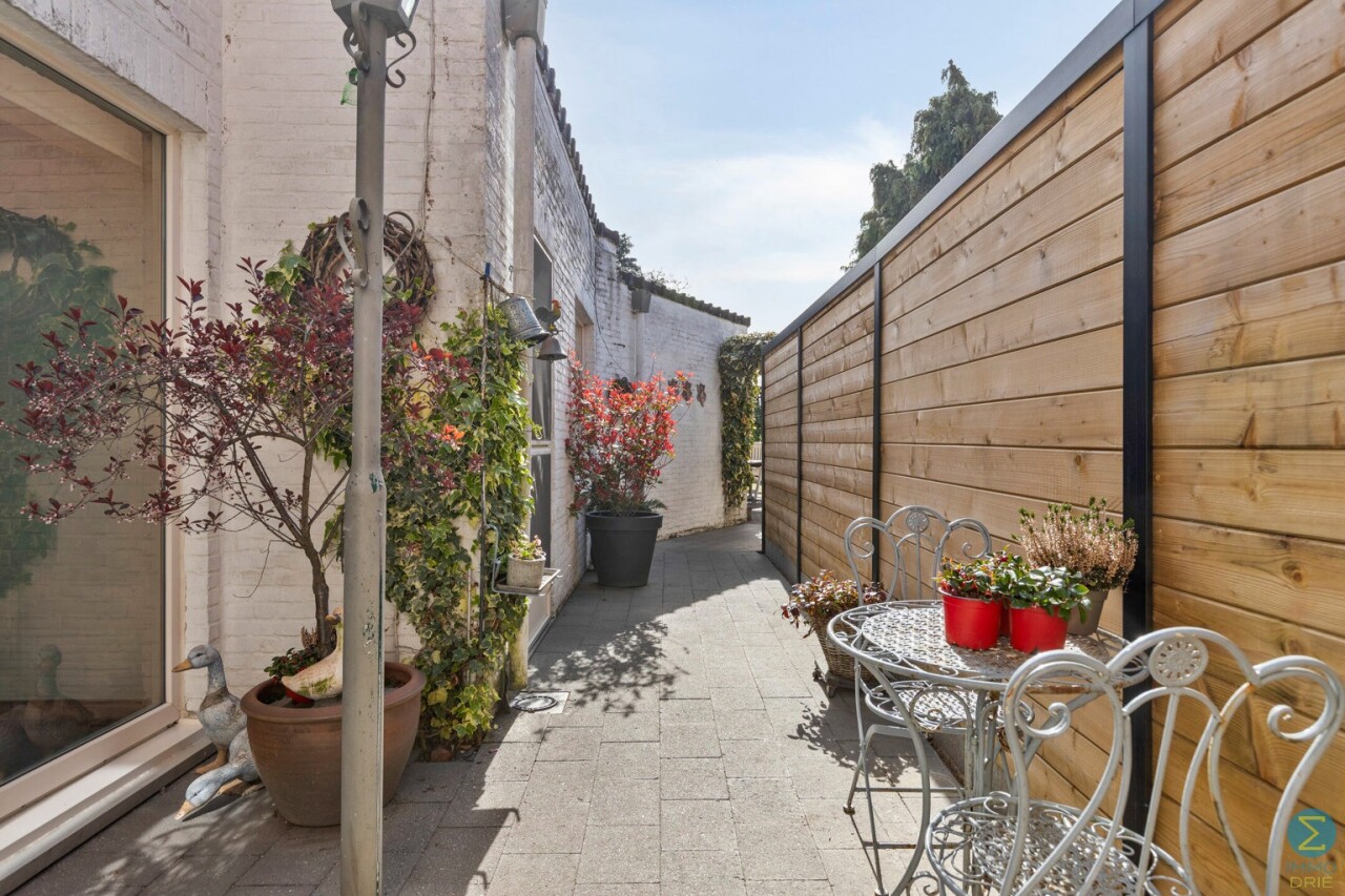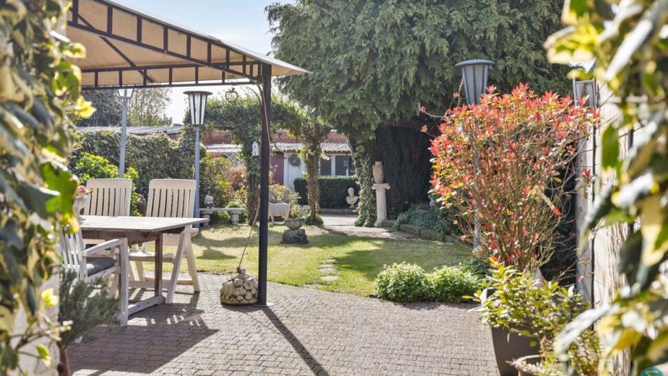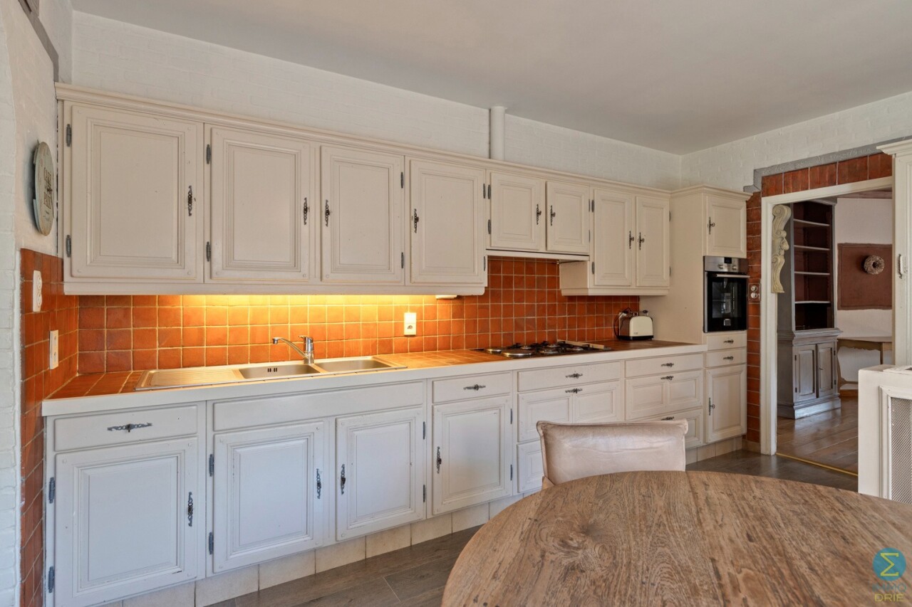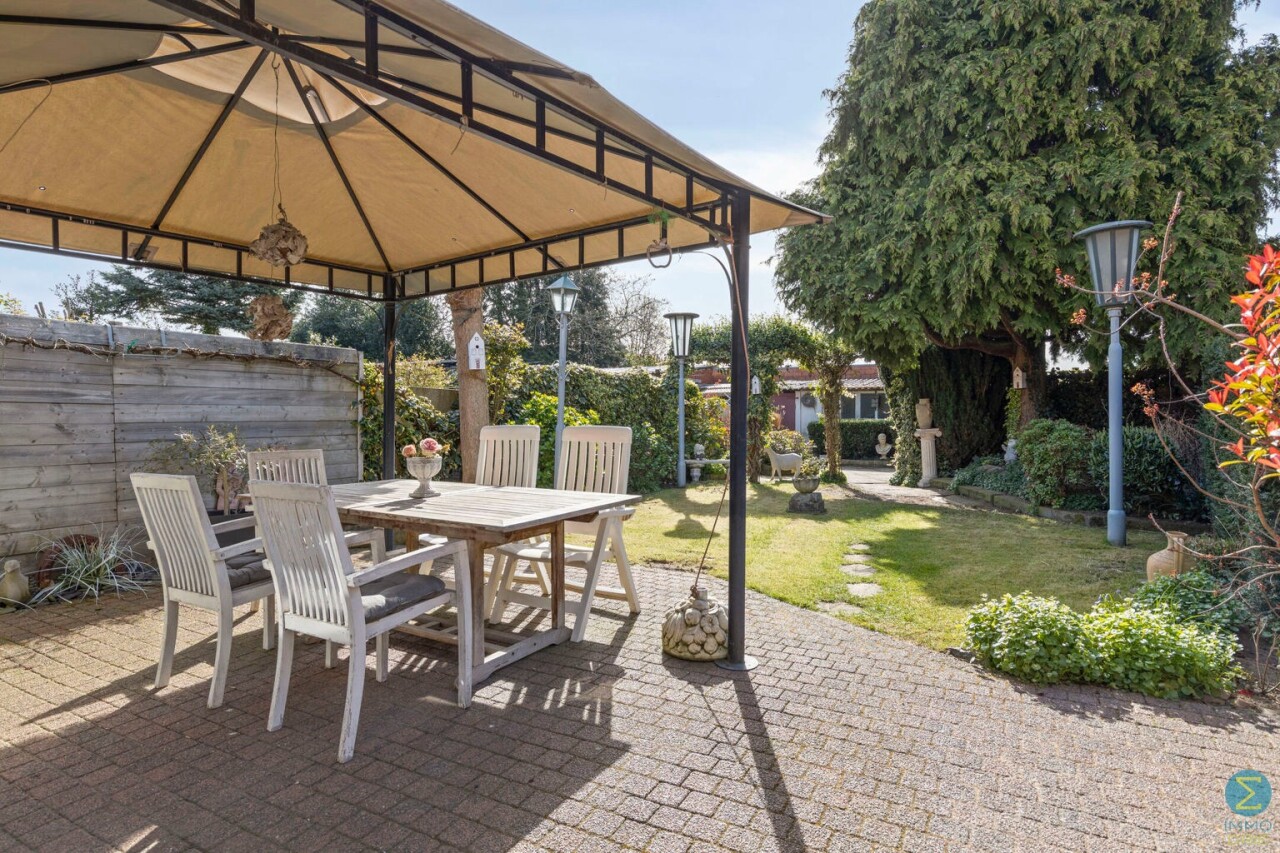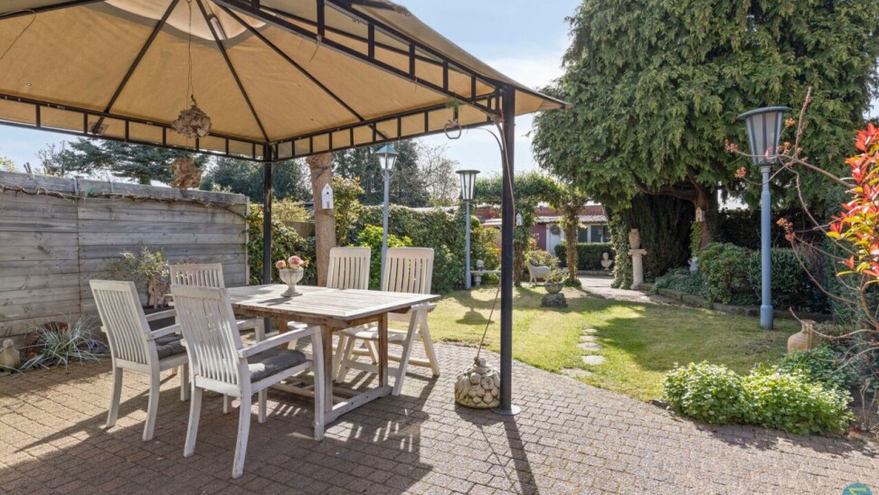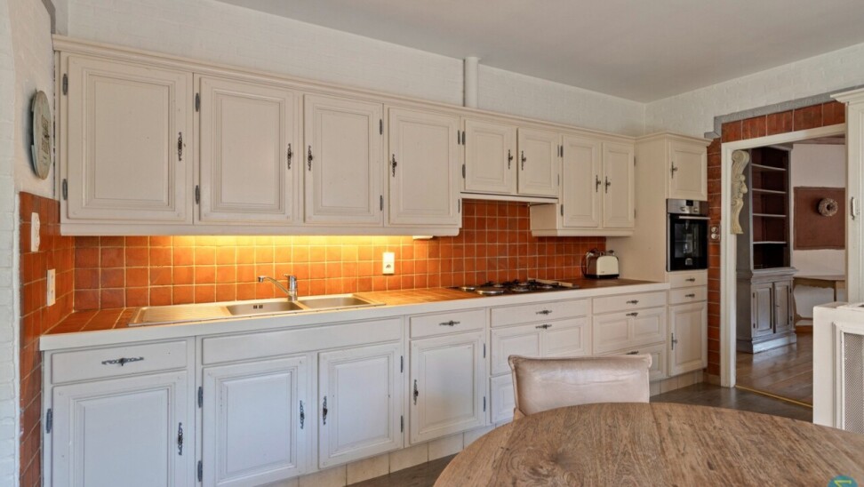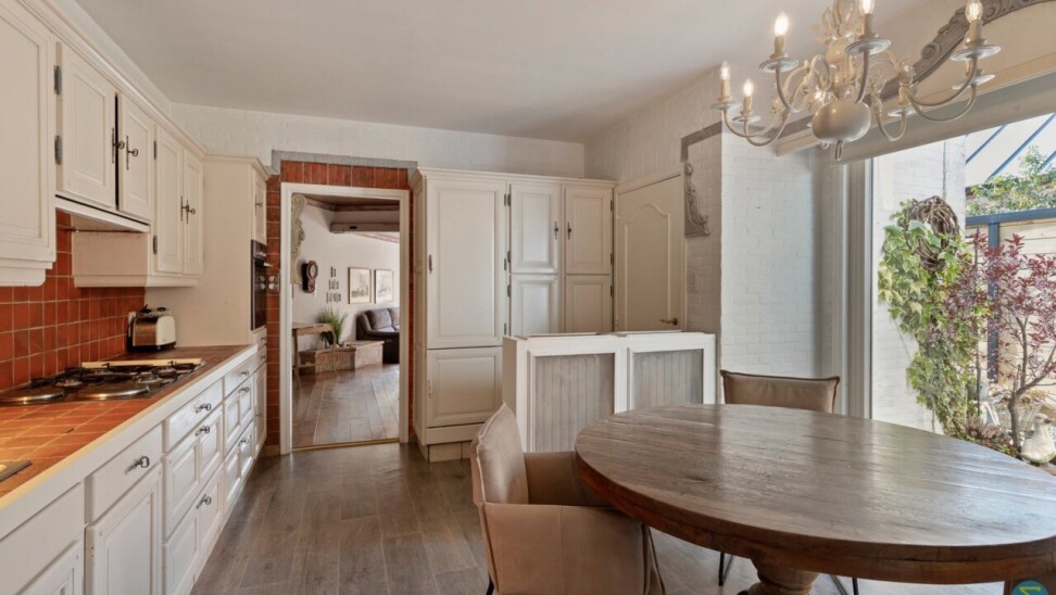 De ruime, ingerichte keuken met gezellige ontbijthoek vormt het hart van de woning en sluit naadloos aan op de lichtrijke woonkamer met parketvloer en mooi zicht op de verzorgde, zuidgerichte tuin.