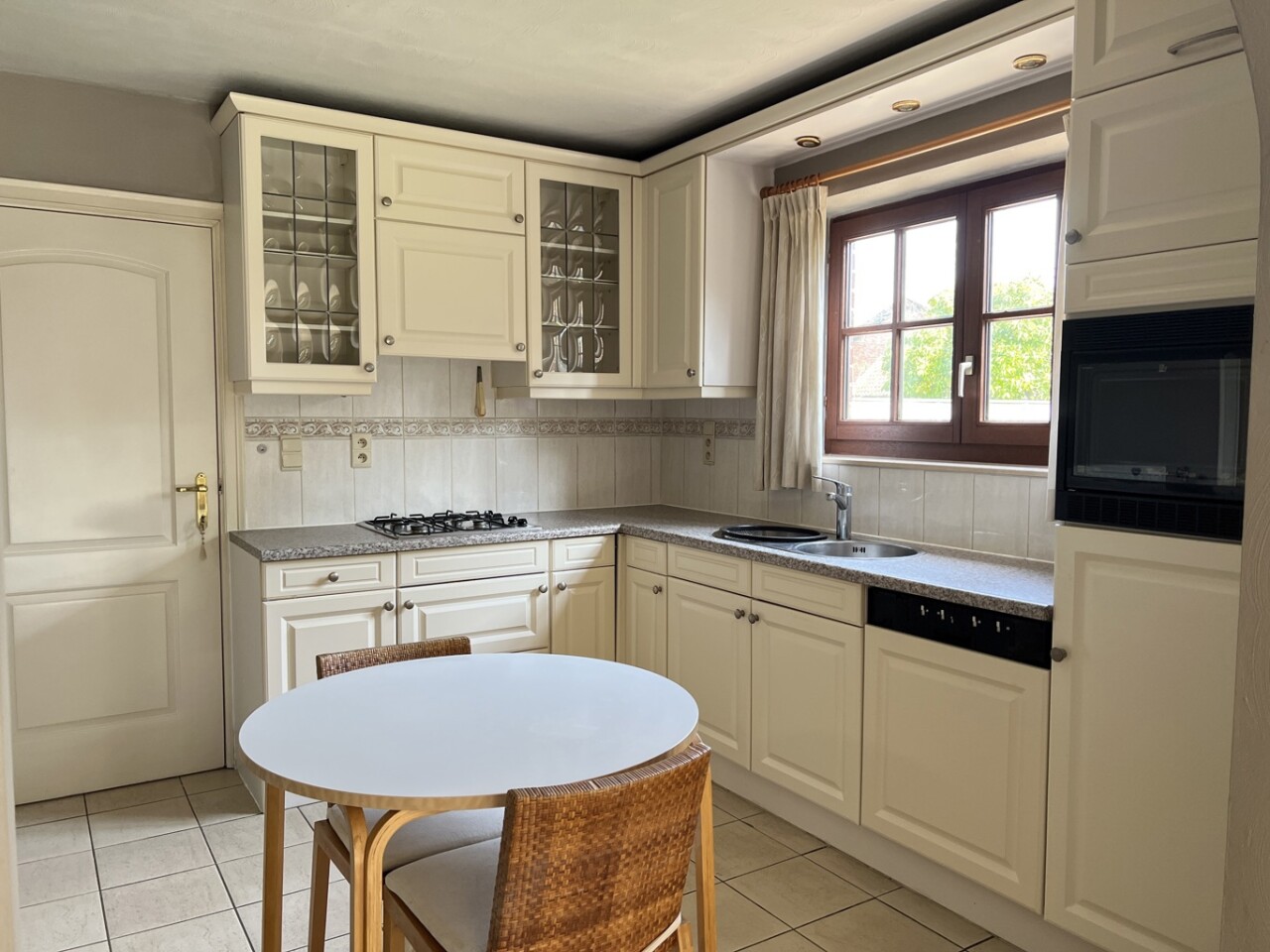 We betreden de woning via de inkomhal met afzonderlijk gastentoilet. Wanneer we verder lopen komen we in de ruime woonkamer met haard en mooi uitzicht op de tuin. Naast de woonkamer bevindt zich de keuken met aansluitende berging. Verder is er nog een afzonderlijke was- en strijkkamer, een extra berging met trap naar de verdieping. Er zijn op de begane grond nog 2 slaapkamers met naastliggende badkamer, zodat het voor zowel gezinnen als ouderen ideaal is.