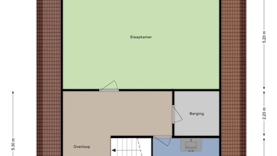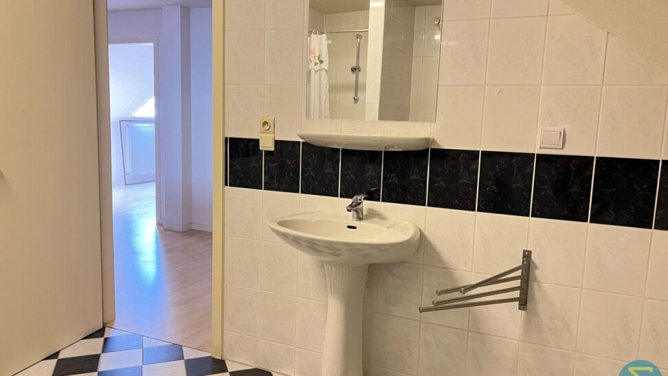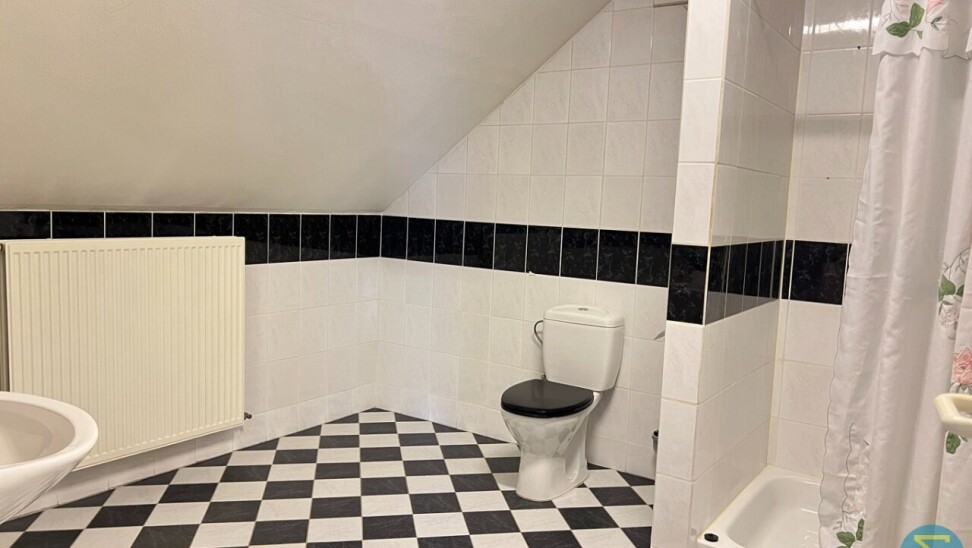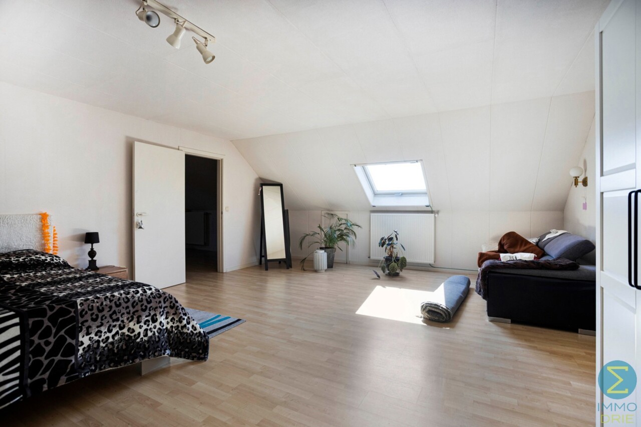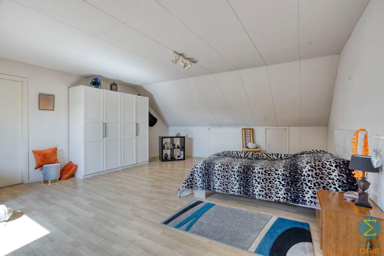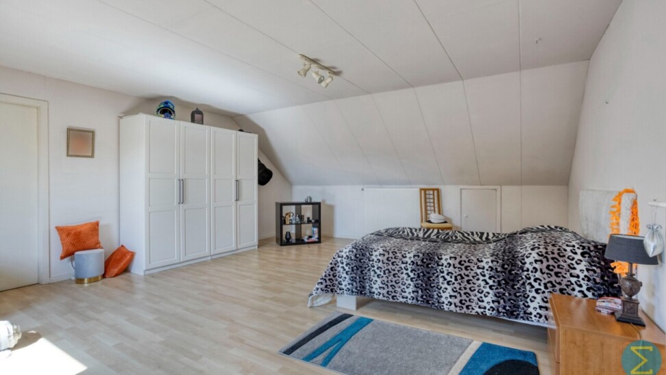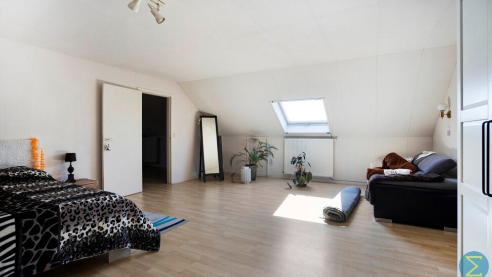 Op de verdieping is er een ruim bordes en een hele grote slaapkamer met dakvlakraam en opbergruimte, deur naar zolder met Junkers CV gas-installatie, afzonderlijke dressing, tweede badkamer met toilet, lavabo en douche.
