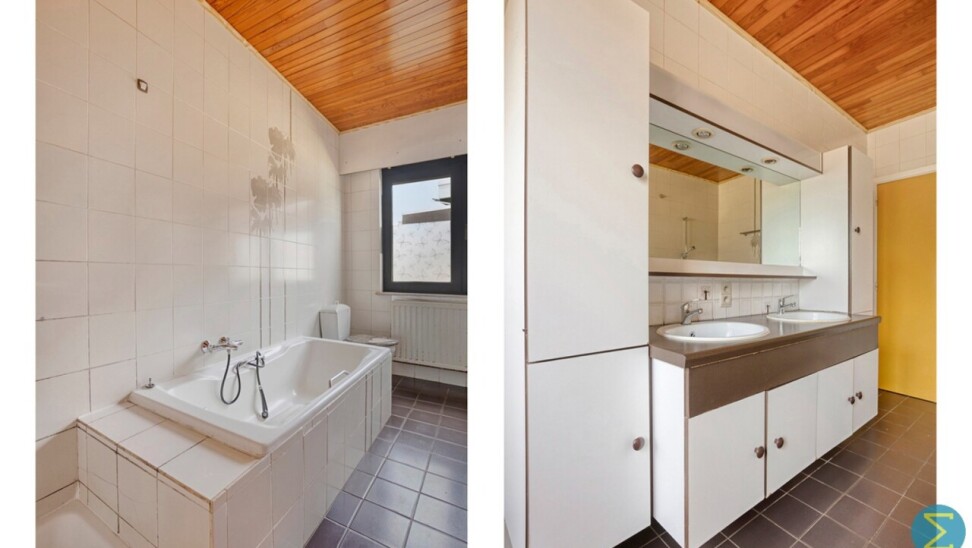 Op het gelijkvloers beschikt de woning over twee slaapkamers, een apart gastentoilet en een badkamer voorzien van ligbad, douche, een lavabomeubel met dubbele wastafel en een extra toilet.