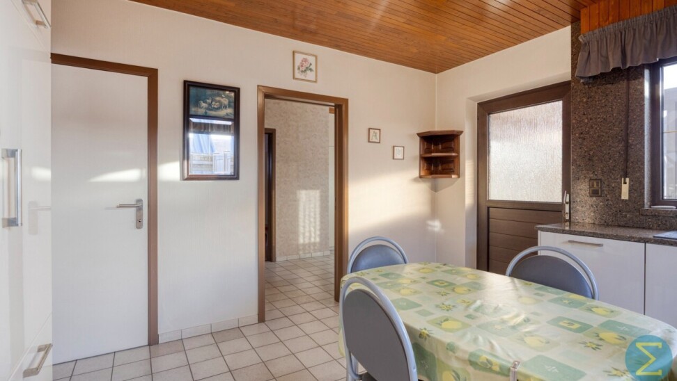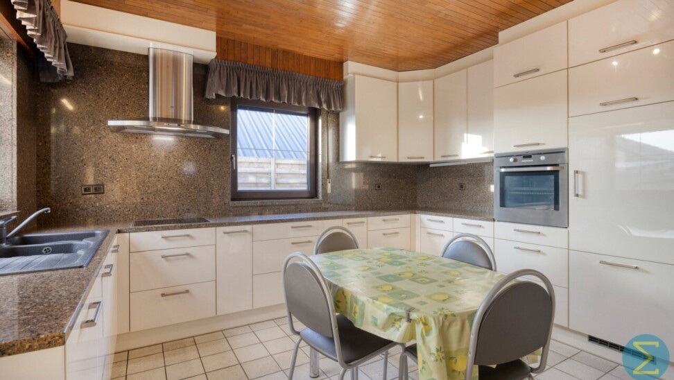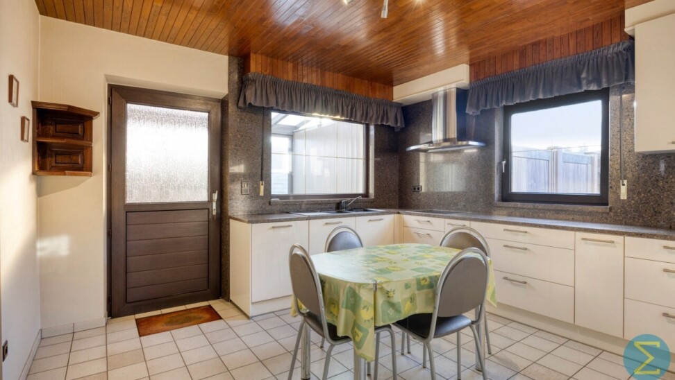 Bij het betreden van de woning komt u in de inkomhal met gastentoilet. De ruime woonkamer is voorzien van een sfeervolle sierhaard en sluit naadloos aan op de moderne leefkeuken, uitgerust met alle hedendaags comfort. Vanuit de keuken heeft u toegang tot de achterliggende veranda, waar het aangenaam vertoeven is met zicht op de tuin.