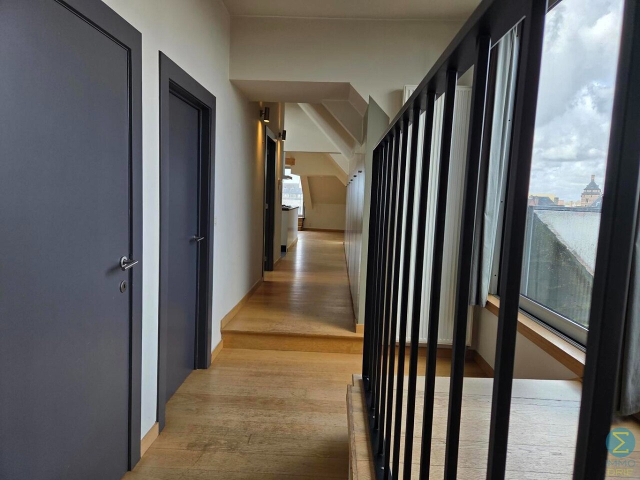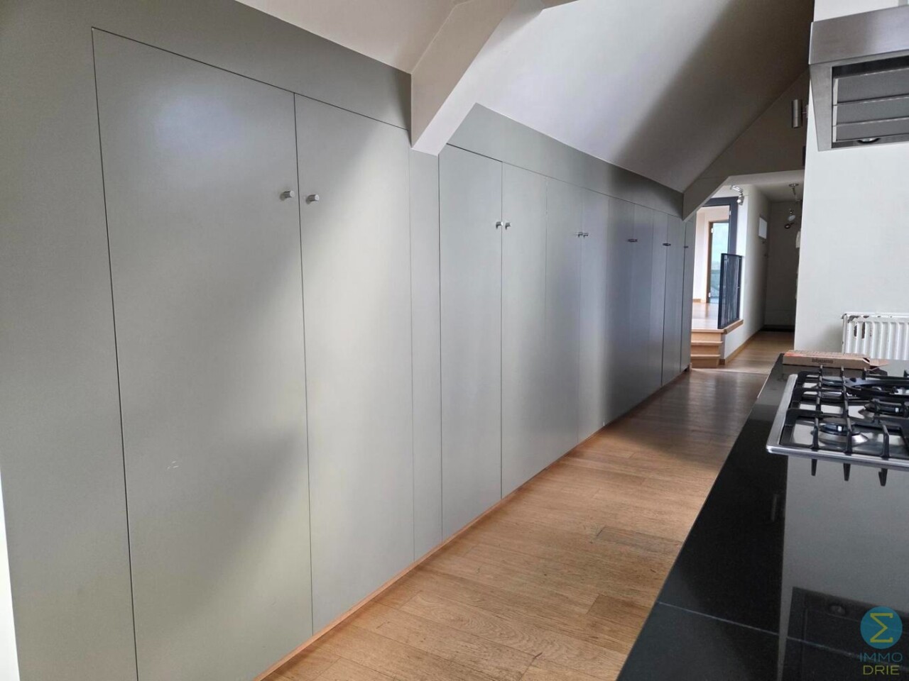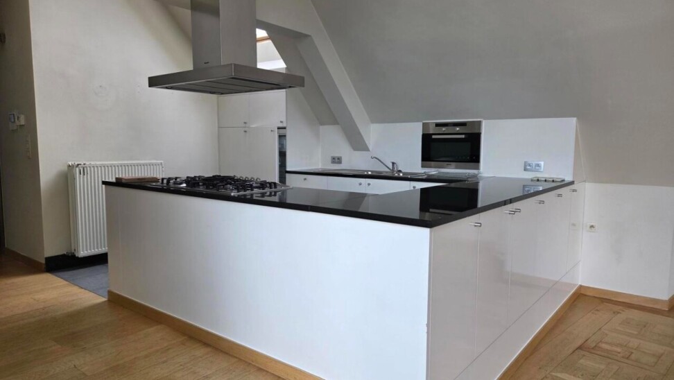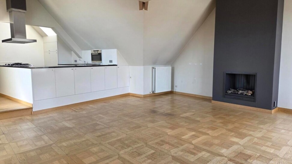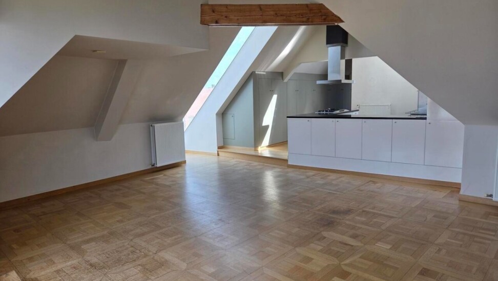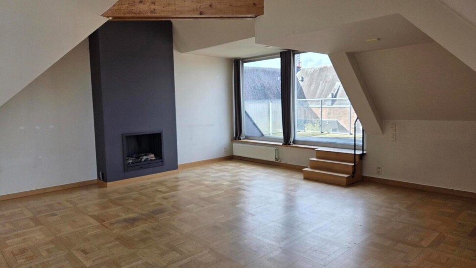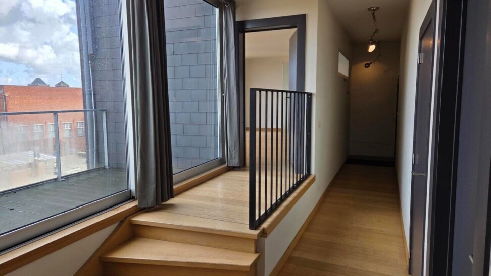 Het penthouse ademt karakter dankzij de hoge plafonds, zichtbare houten balken en een prachtige sierhaard. Doorheen de gang zijn er ingebouwde kasten voorzien die zorgen voor voldoende opbergruimte en ruimte waar de wasmachine en droogkast geplaatst kunnen worden.