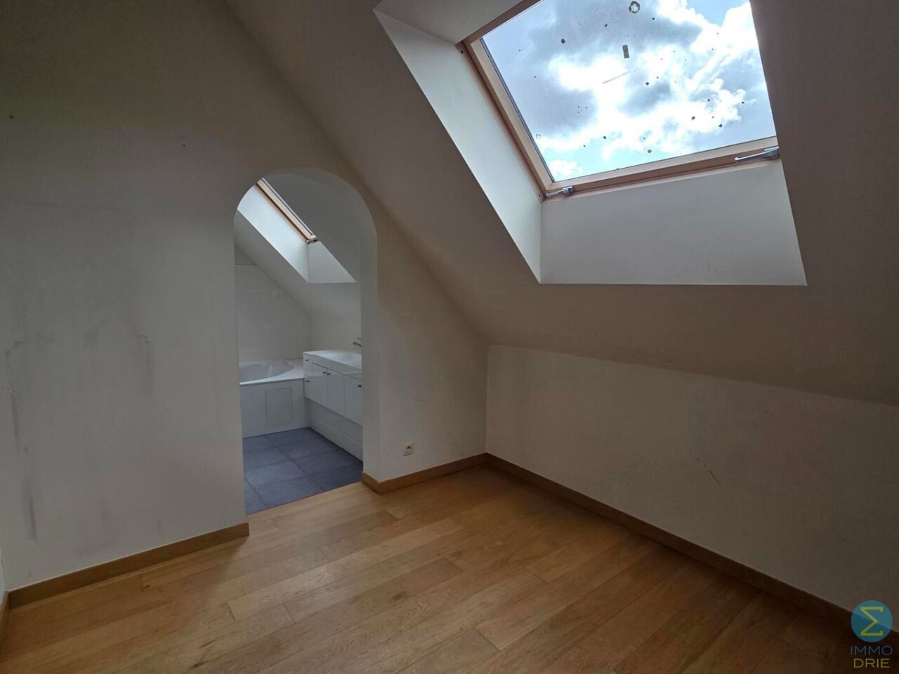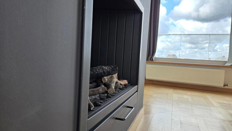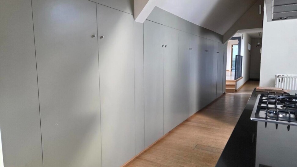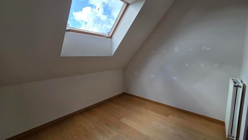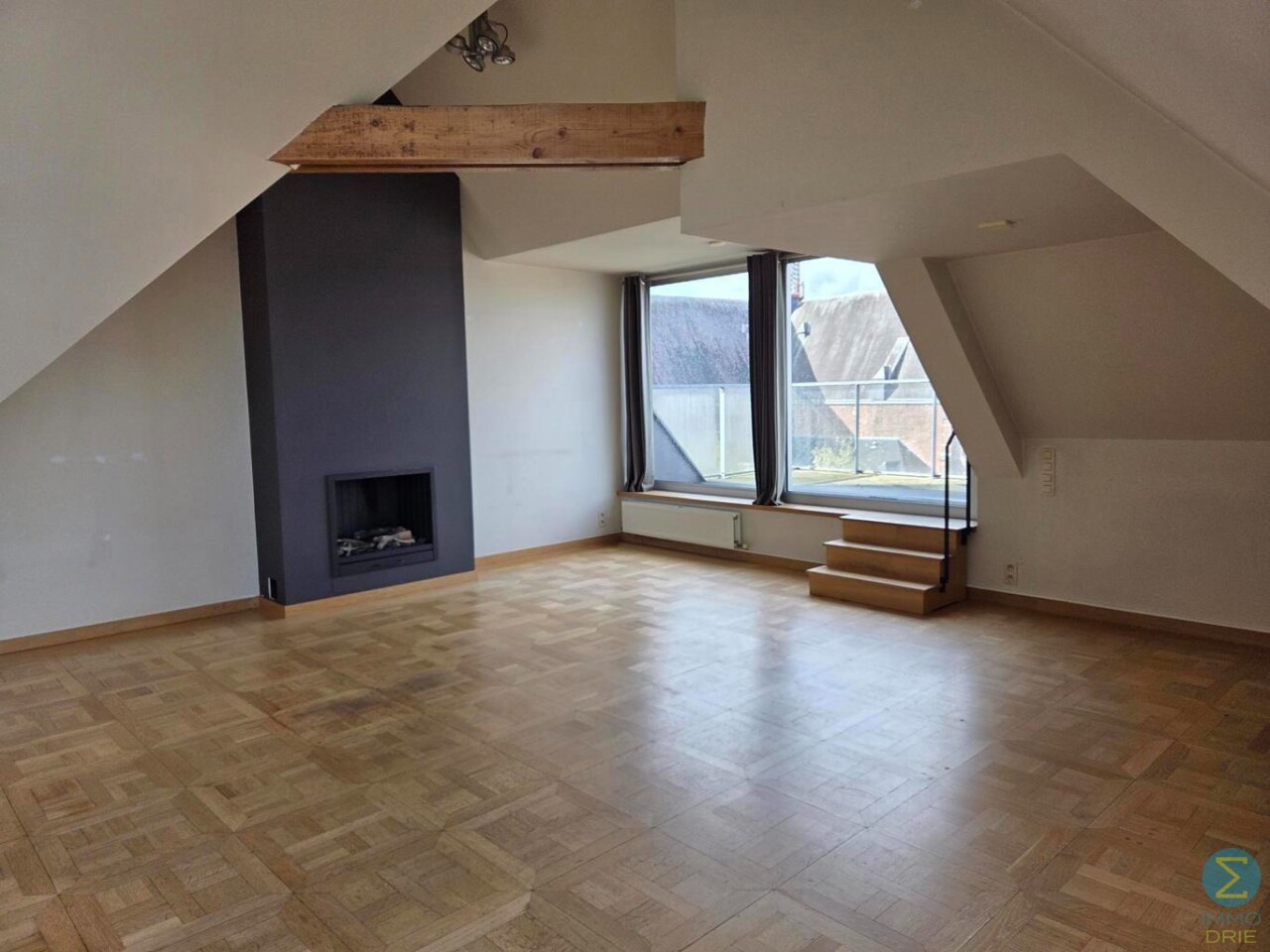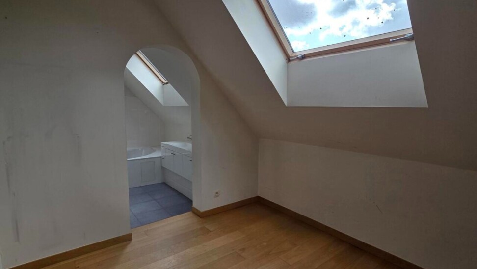 Het penthouse ademt karakter dankzij de hoge plafonds, zichtbare houten balken en een prachtige sierhaard. Doorheen de gang zijn er ingebouwde kasten voorzien die zorgen voor voldoende opbergruimte en ruimte waar de wasmachine en droogkast geplaatst kunnen worden.