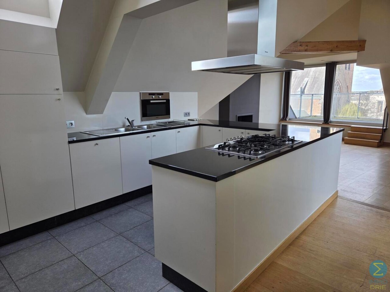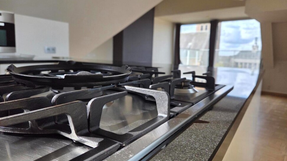De gang loopt door naar de leefruimte en open keuken. Deze keuken is volledig uitgerust met alle moderne comfort en luxe, inclusief een gasvuur. De leefruimte baadt in natuurlijk licht dankzij een grote glaspartij en biedt een prachtig zicht op zowel de keuken als het westgerichte terras. Vanop dit terras geniet u van een uniek uitzicht op de kathedraal en het centrale marktplein.