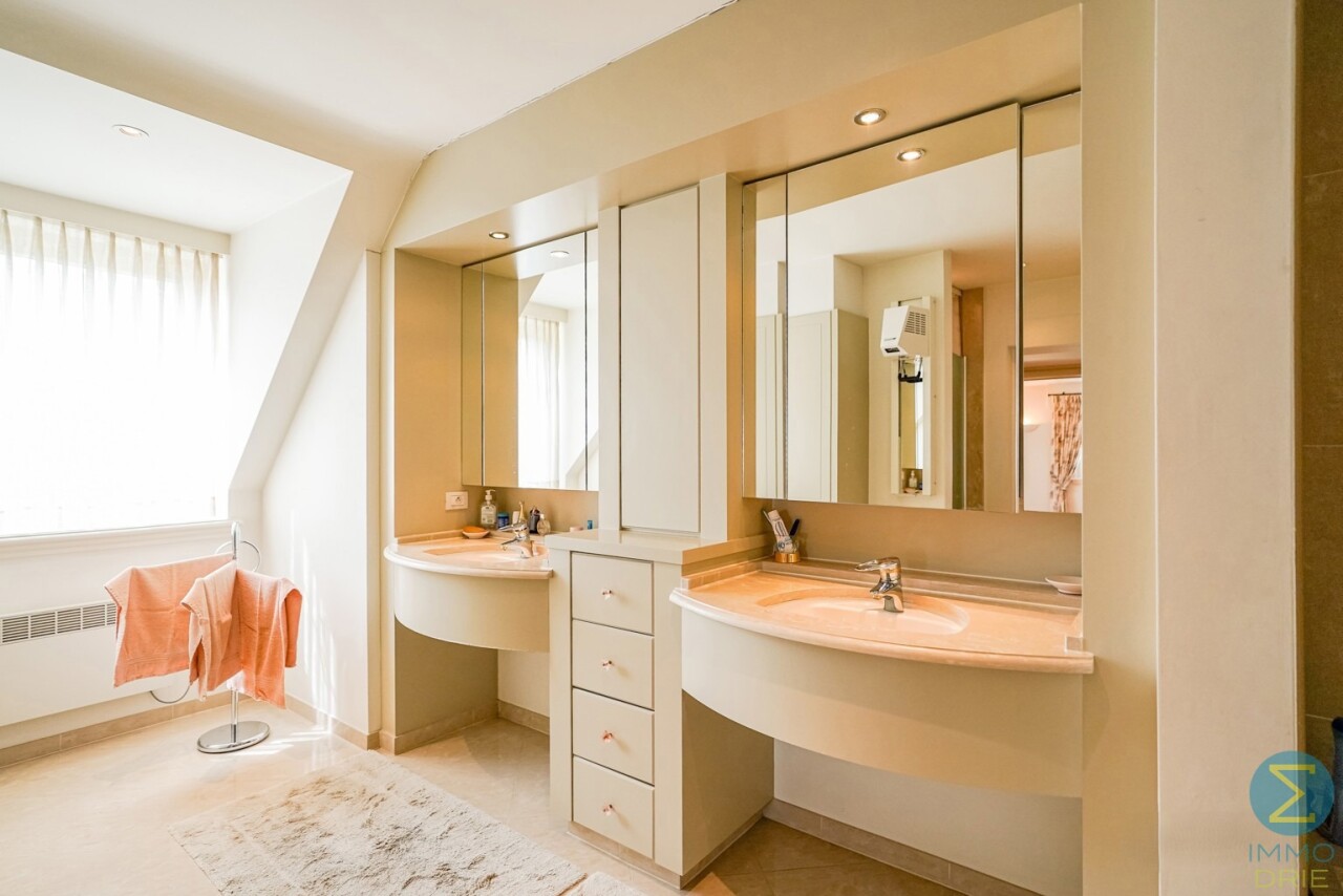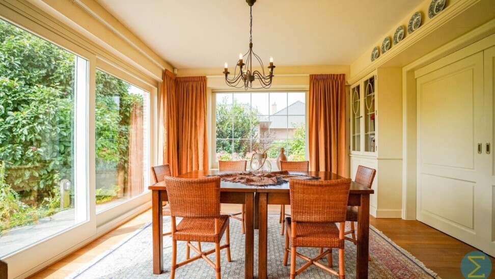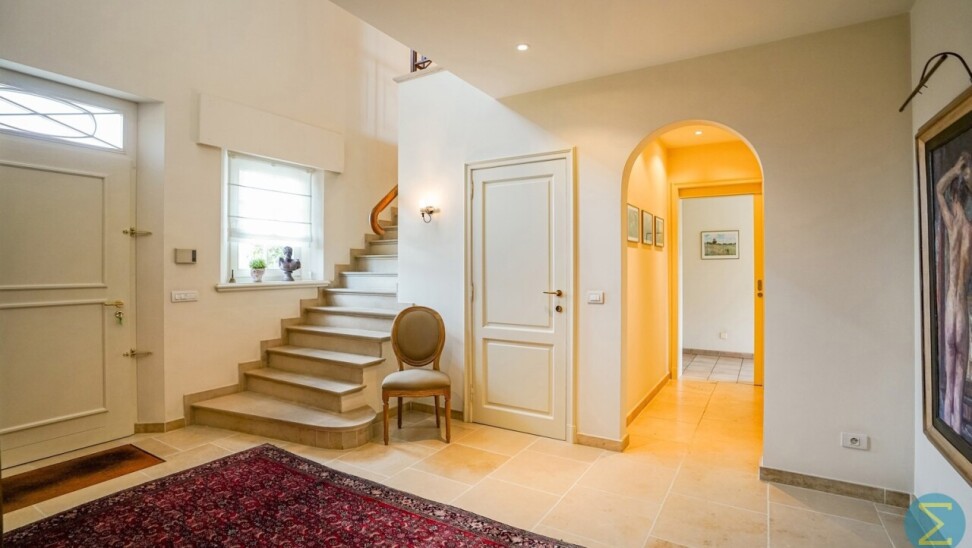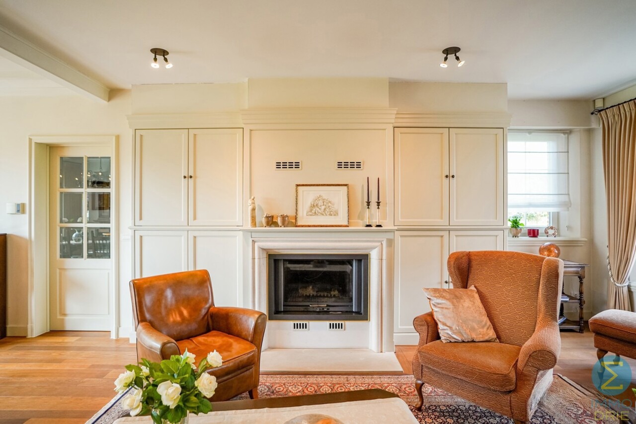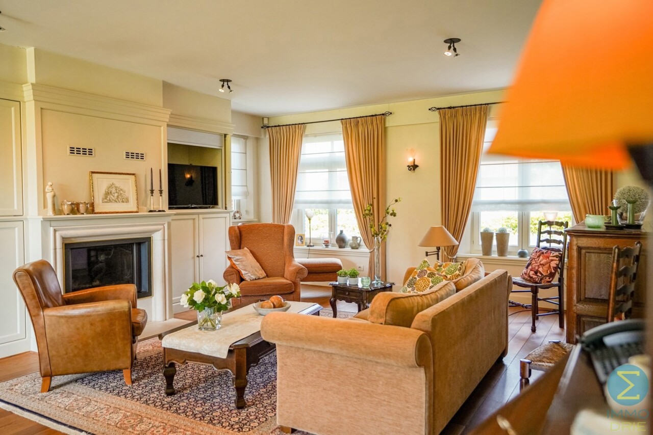 Via de royale inkomhal met imposante marmeren trap en vestiaire betreedt u deze stijlvolle woning. De ruime woonkamer met parketvloer en open haard ademt warmte en klasse uit, en biedt dankzij het grote raampartij een prachtig zicht op de verzorgde tuin. Aansluitend bevindt zich de gezellige tuinkamer, eveneens met tuinzicht, en een ingericht bureel – ideaal voor wie thuis werkt.