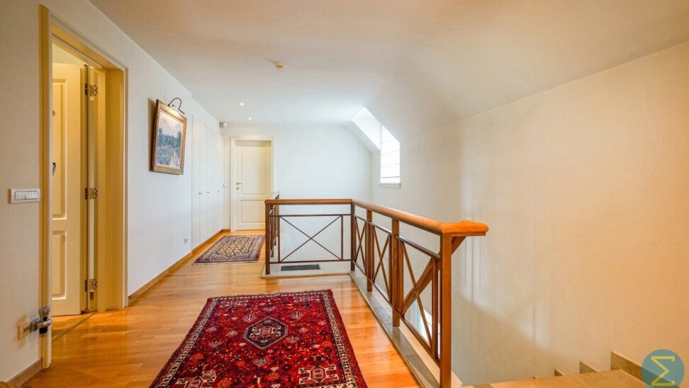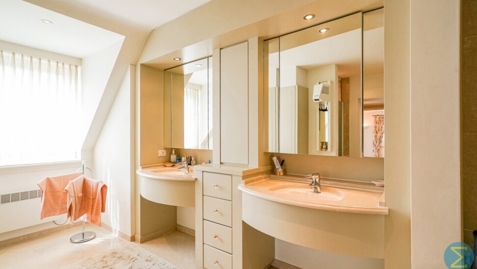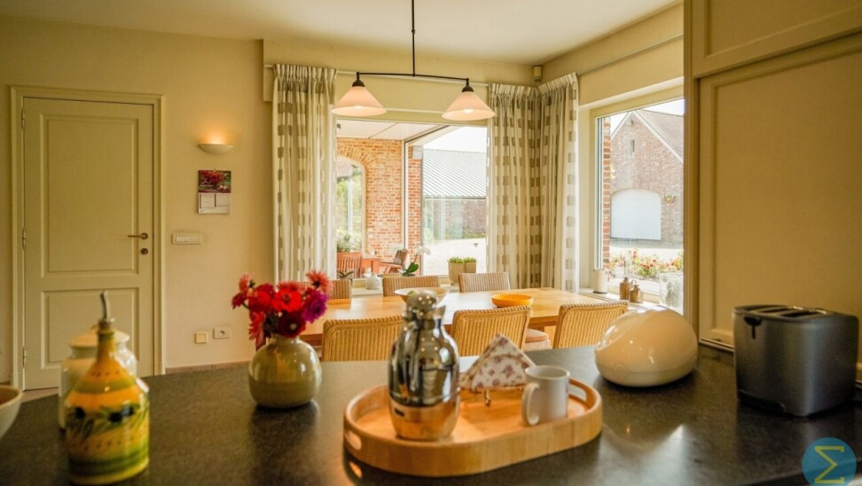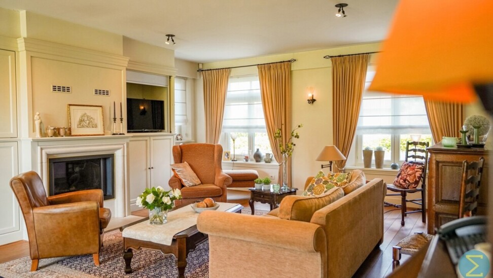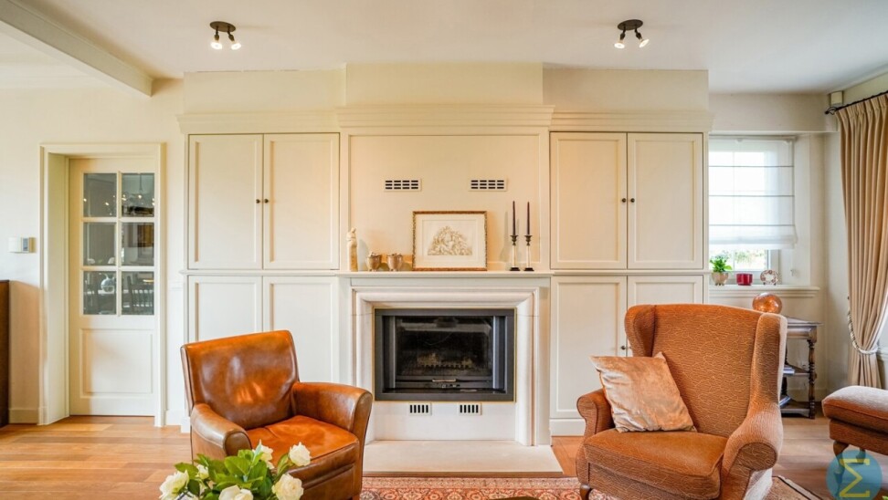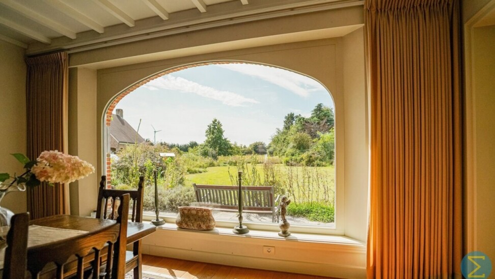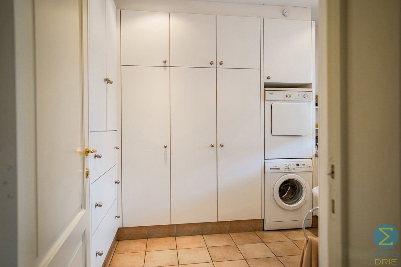 Via de royale inkomhal met imposante marmeren trap en vestiaire betreedt u deze stijlvolle woning. De ruime woonkamer met parketvloer en open haard ademt warmte en klasse uit, en biedt dankzij het grote raampartij een prachtig zicht op de verzorgde tuin. Aansluitend bevindt zich de gezellige tuinkamer, eveneens met tuinzicht, en een ingericht bureel – ideaal voor wie thuis werkt.