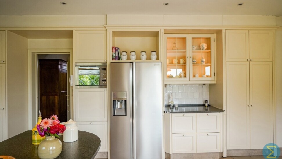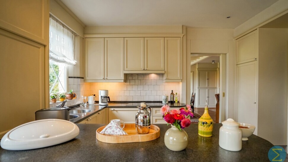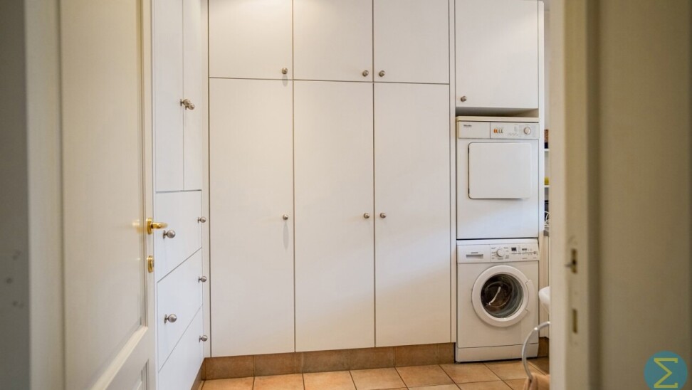 De volledig ingerichte leefkeuken met ontbijthoek is voorzien van alle comfort en grenst aan een afsluitbaar overdekt terras. Verder vindt u op het gelijkvloers een achterinkom met vaste kasten, ingerichte wasplaats met douche, koele berging en een inpandige dubbele garage met automatische poorten en veel opbergruimte.