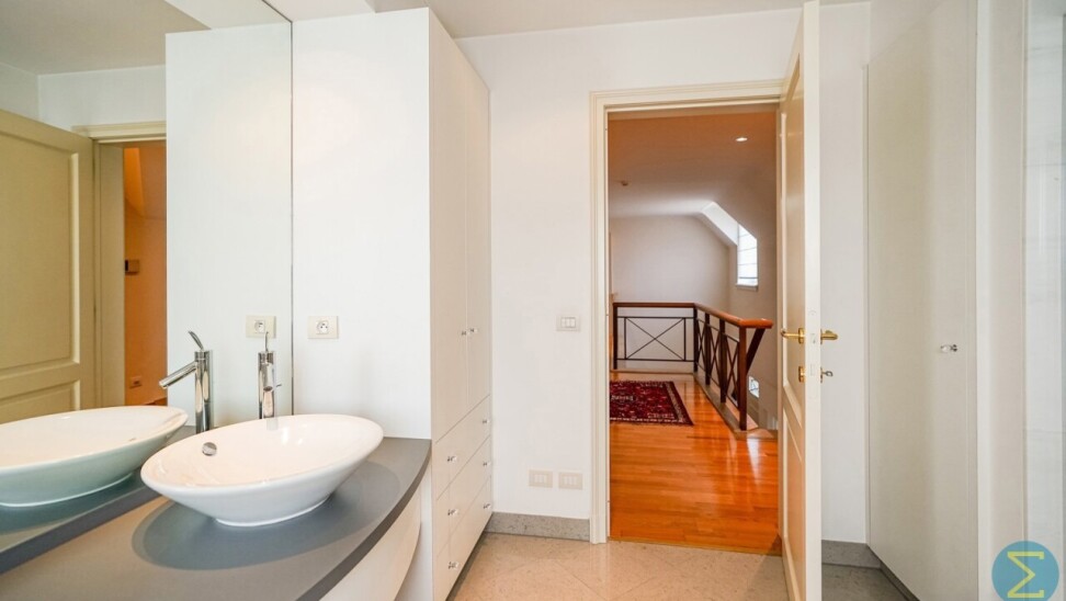 De verdieping biedt twee royale slaapkamers, waaronder een master bedroom met ingerichte dressing en eigen badkamer met bubbelbad, dubbele wastafel, douche en een apart toilet. Daarnaast is er een tweede badkamer met douche, wastafel en toilet. De ruime overloop geeft toegang tot twee zolderkamers die eenvoudig kunnen worden omgevormd tot extra slaapkamers of hobbyruimtes. Via een vlizotrap bereikt u nog een praktische bergzolder.